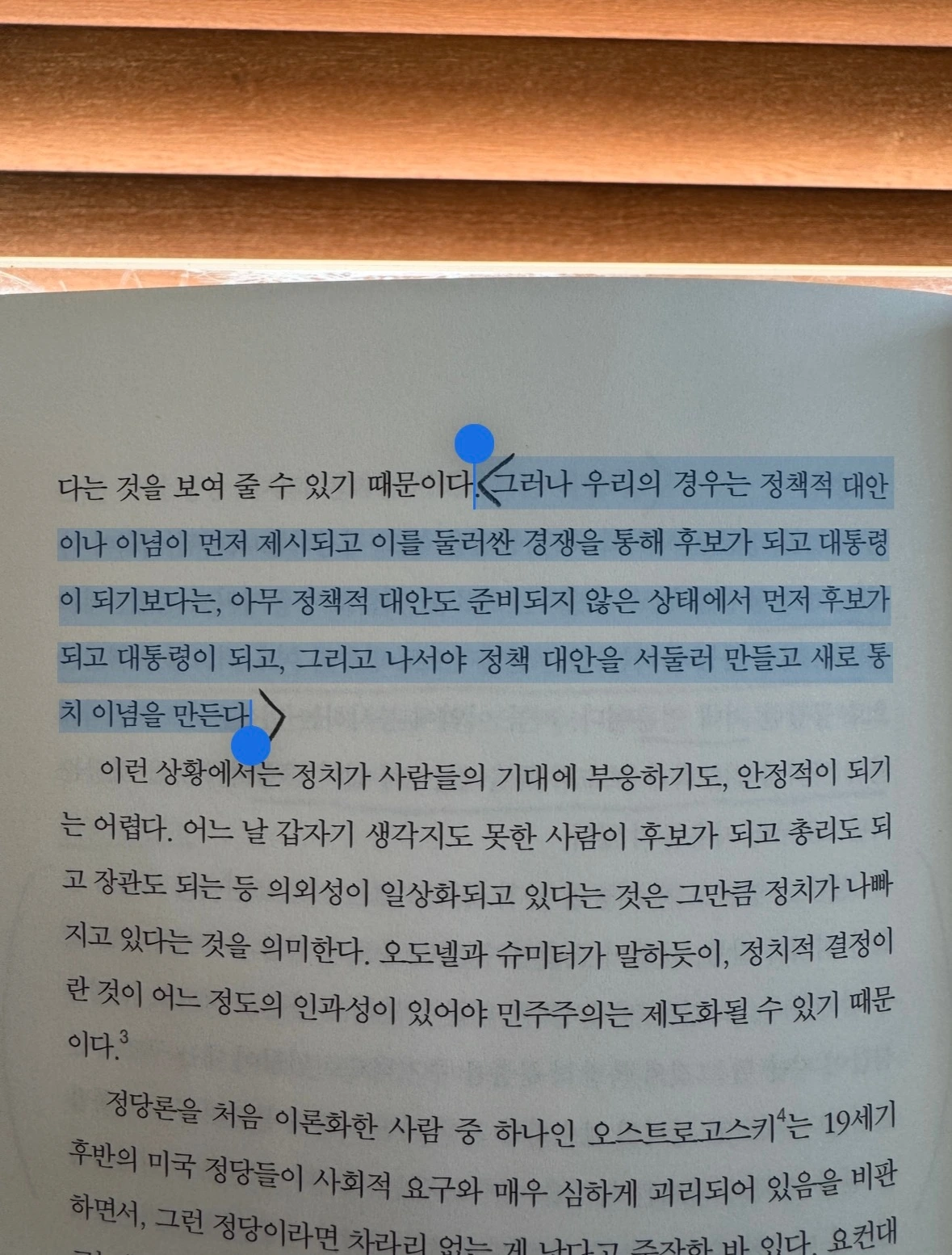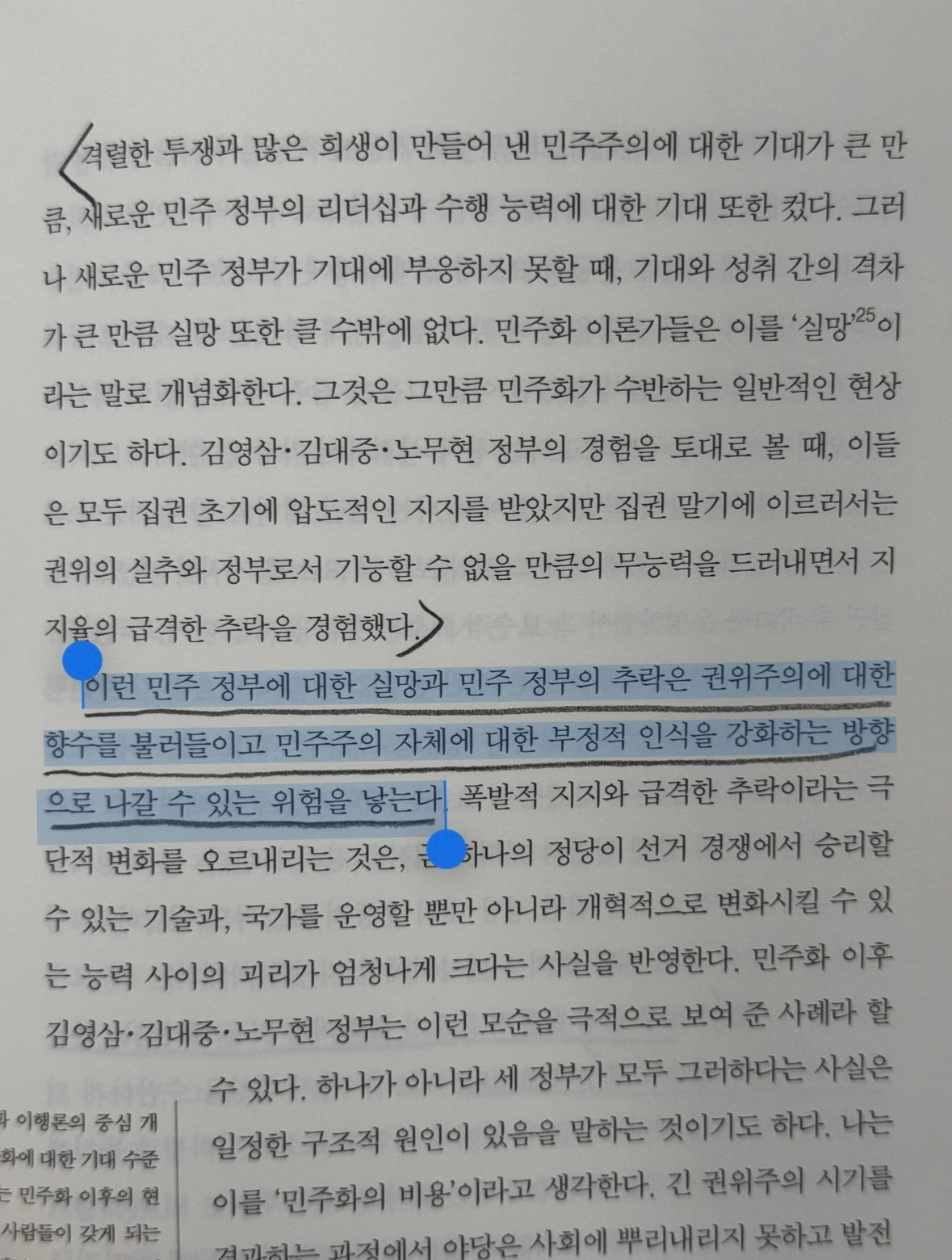 저자는 시민사회 개념을 끌어오며 말한다. 서구와 달리 한국은 국가가 먼저 거대한 몸집으로 서 있었고, 사회를 이루는 시민의 힘은 있었지만 그 힘이 정당을 통해 제도정치로 옮겨 타는 관념과 경로가 빈약했다. 그래서 운동으로서의 시민사회는 강했어도, 국가와 시민을 이어 주는 매개가 취약해졌다.