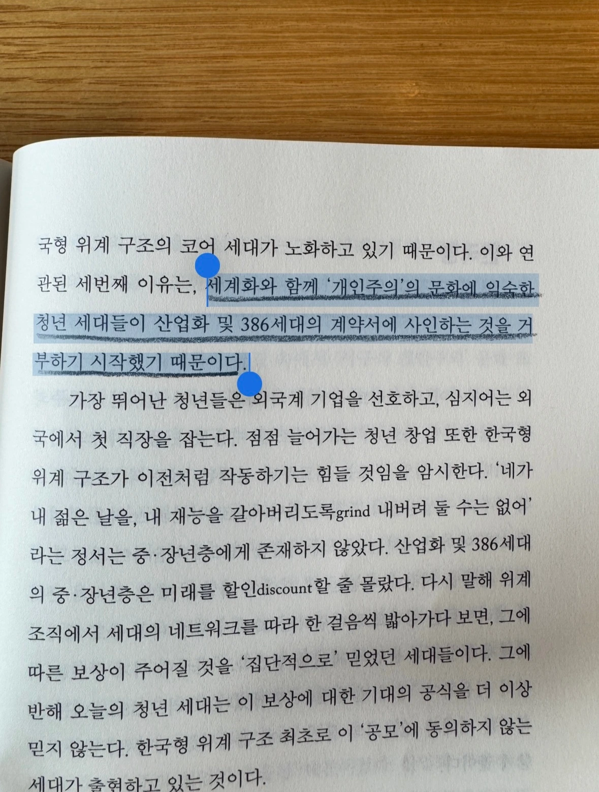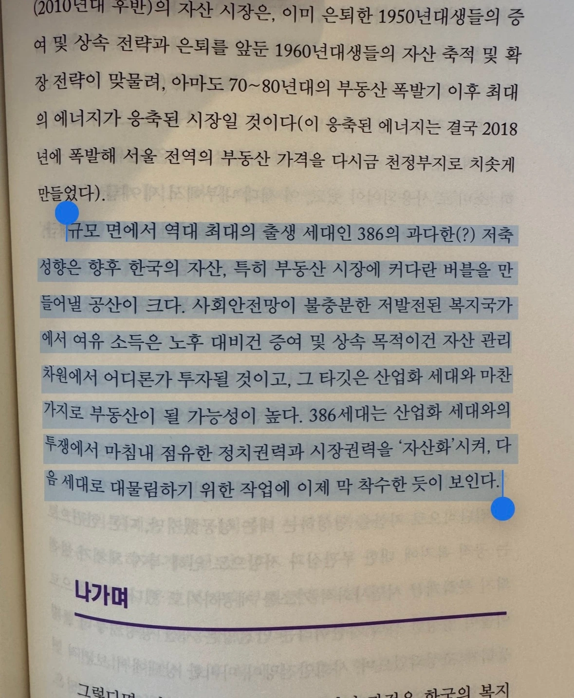 저자는 여러 대안을 제시하지만, 궁극의 메시지는 간명하다. 386세대가 내려놓아야 한다. 스스로 공간을 열지 않는다면, 개인의 합리적 선택이 모여 사회적 비효율을 키우는 역설은 계속될 것이다.