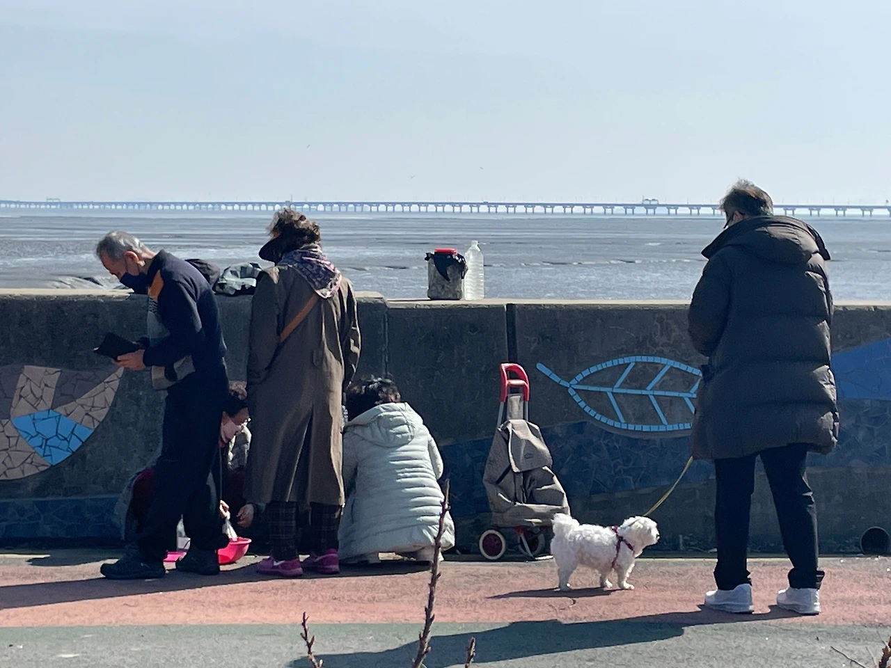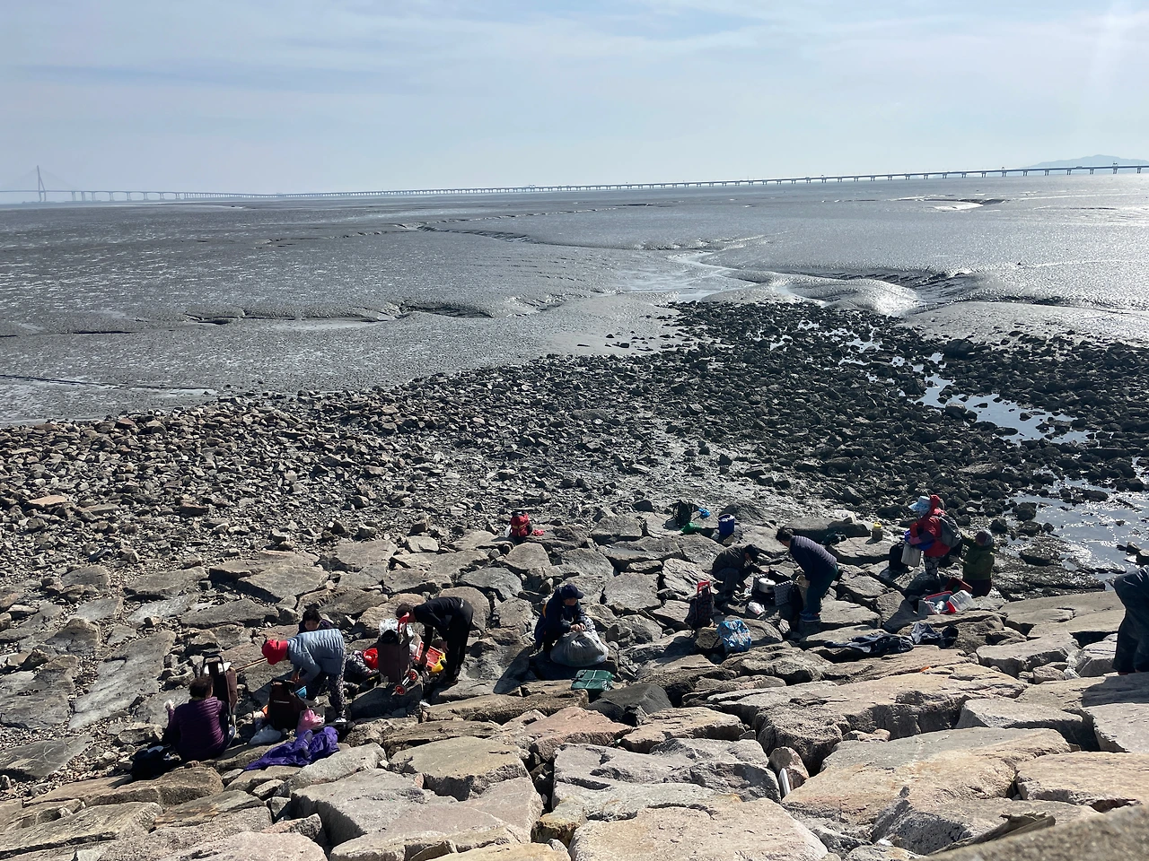 물 빠진 바다에 내려가서 굴을 캐는 사람들도 있었다. 김치통 같은 곳에 가득 채운 굴을 가지고 사람들이 둥글게 모여들어 가격을 흥정하고, 흥정하는 걸 구경했다. 물 빠진 바다에 볼거리라곤 없는 줄 알았는데, 누군가는 바다에 물이 빠지기만을 기다렸던 것이다. 몸을 바짝 붙여서 둑 아래를 내려다보니 저 멀리 뻘에서 돌아오는 상인들이 보였다. 밀물 때가 된 건지 둑 아래 자리 잡은 상인들은 빨간 바구니와 플라스틱 통을 주섬주섬 챙겨가며 장을 정리했다.