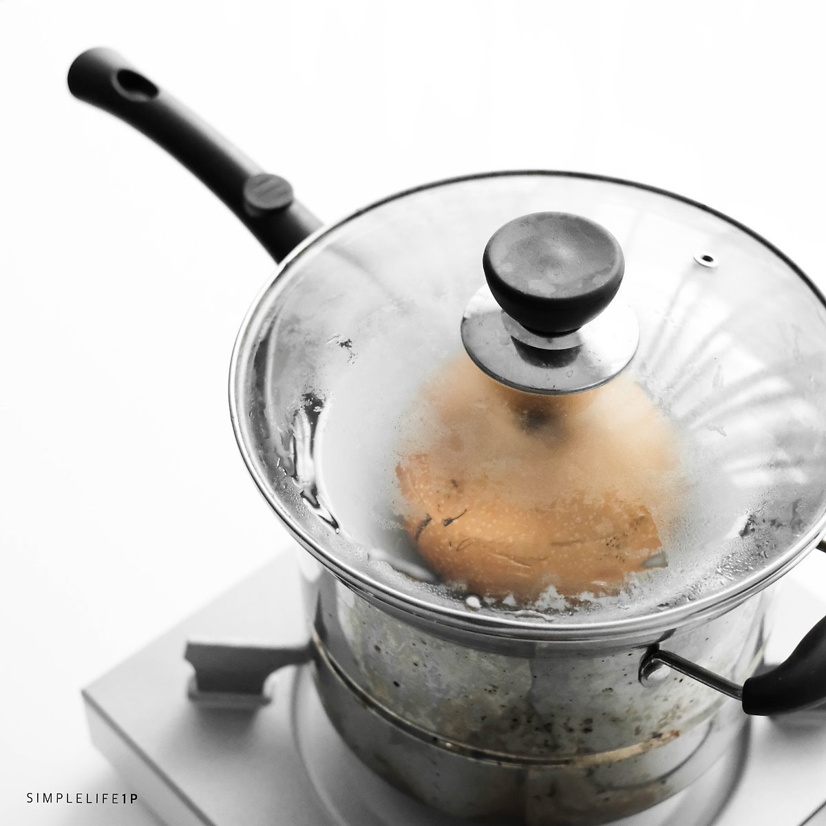 그릇에 배를 담고 김이 오른 찜통에 넣어주세요. 찜통에서 약 40분간 중탕으로 익혀주세요.