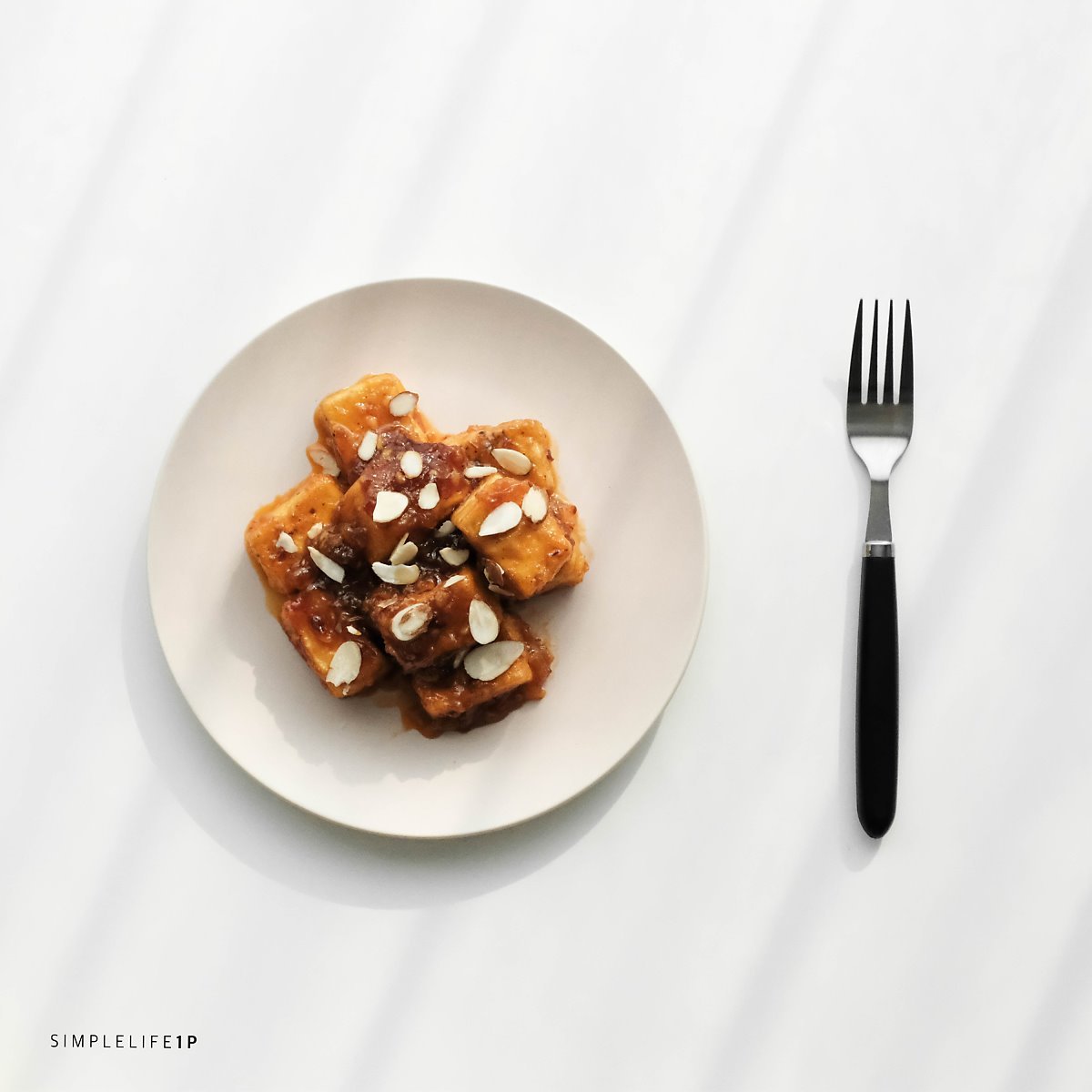 완성된 칠리두부강정을 그릇에 담고, 아몬드 슬라이스를 뿌려 마무리하세요.