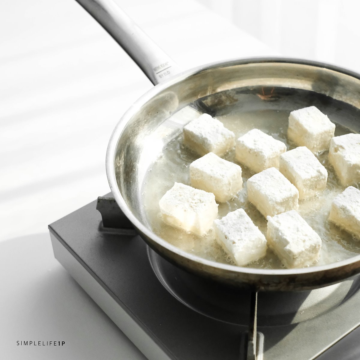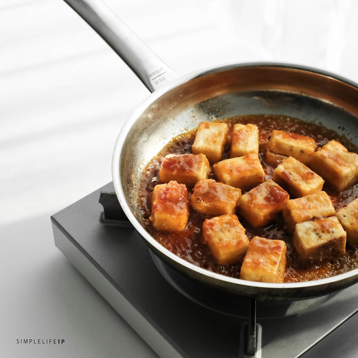 달군 팬에 기름을 두르고, 두부를 노릇하게 튀겨주세요. 노릇하게 익은 두부 튀김은 체에 밭쳐 기름을 빼주세요. 소스를 중불에서 걸쭉해질 때까지 끓인 후 두부 튀김을 넣어 고루 섞어주세요.