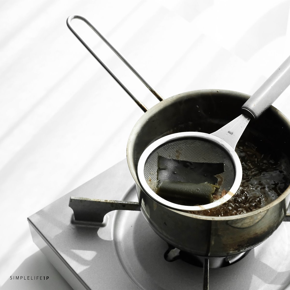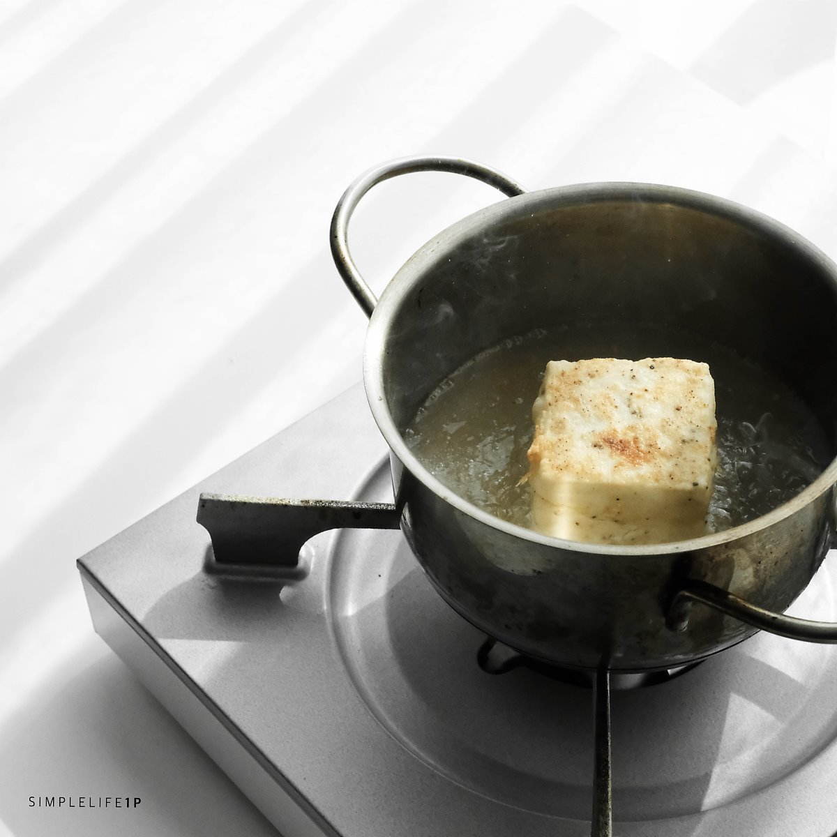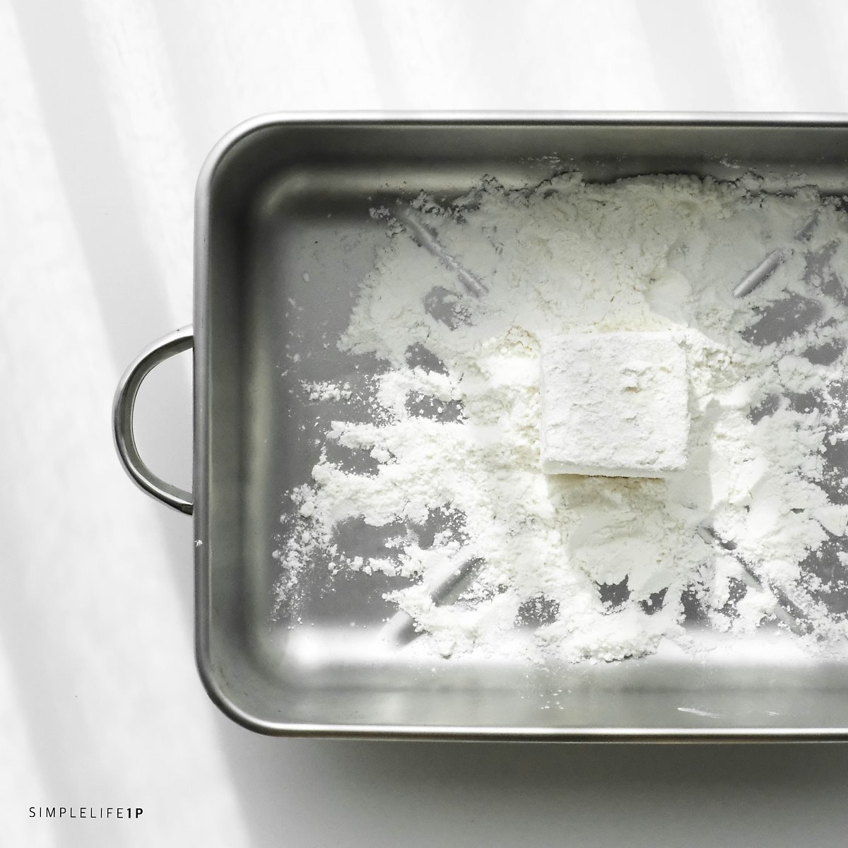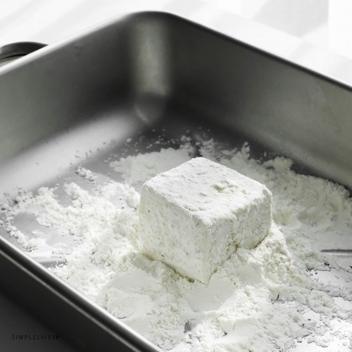 냄비에 소스 재료를 넣고 팔팔 끓여주세요. 물이 끓으면 다시마를 건져내주세요. 두부는 물기를 제거하고, 허브솔트를 뿌려주세요. 두부에 전분가루를 고루 묻혀주세요.