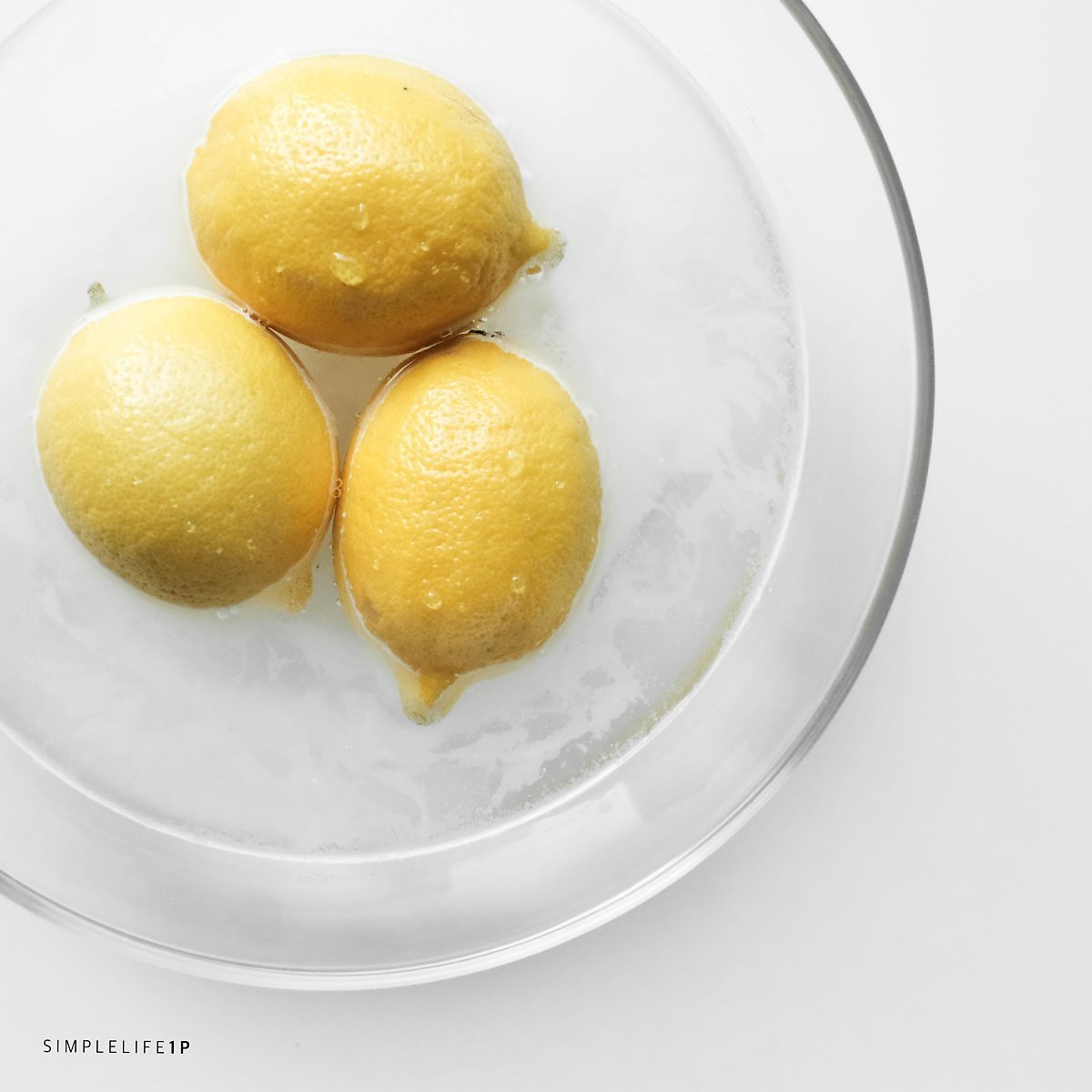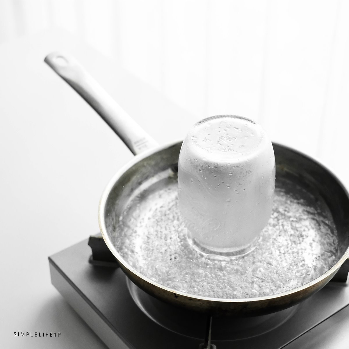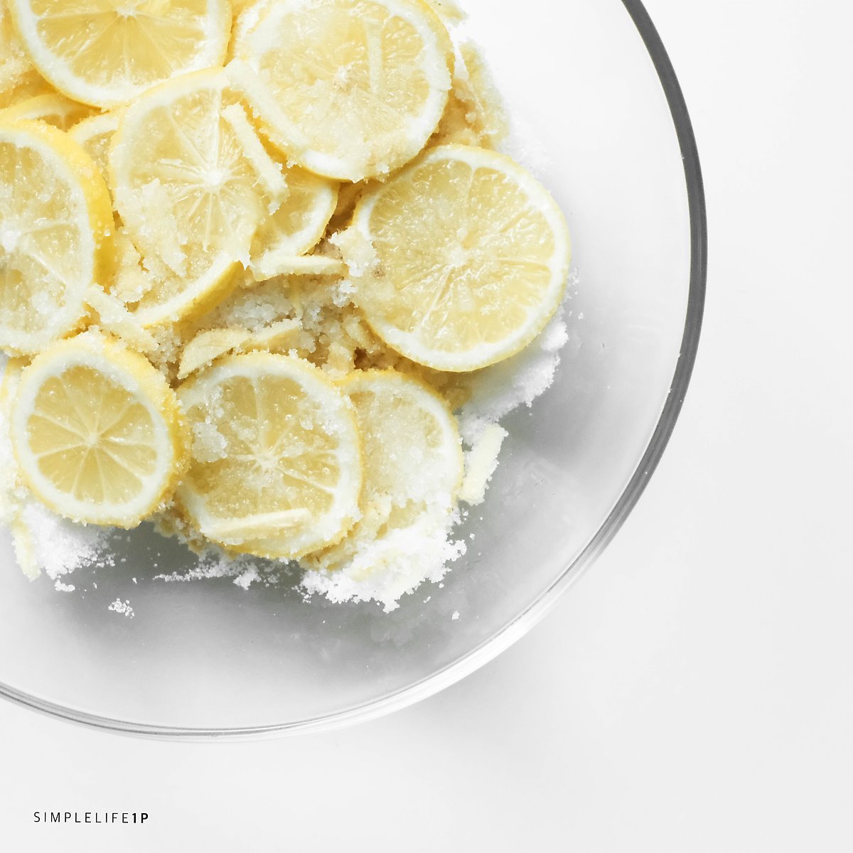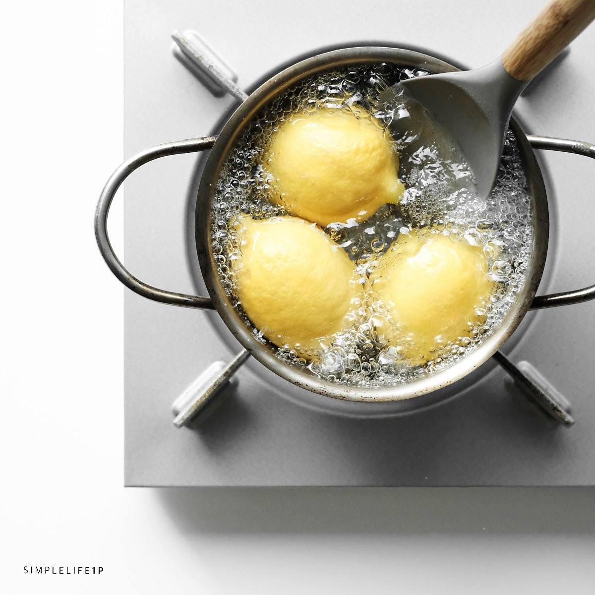 팬에 물을 넣고 유리병을 뒤집어 수증기가 병안으로 들어갈 수 있게 끓여서 소독해주세요. 소독한 유리병은 물기를 제거해주세요. 굵은소금으로 레몬 껍질을 문질러 세척한 후 베이킹 소다와 물을 넣은 볼에 약 15분간 넣어주세요. 끓는 물에 레몬을 살짝 데쳐 껍질의 왁스를 제거해주세요.