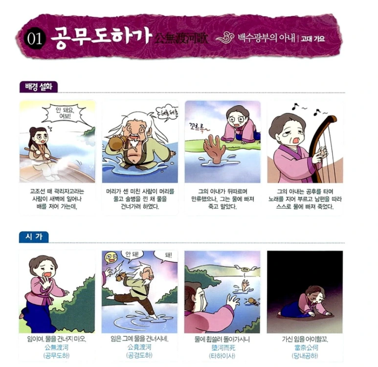 * '공무도하가'라는 고전시가의 이름에서 변형한 '공부도해가'. 자녀의 시험공부를 함께 준비하면서 아이들 공부에 나오는 용어들을 재미있어 풀어냄. 공부는 아이들이 해야하는데 화자인 '백수광부(白首狂婦)'가 하고 있음.