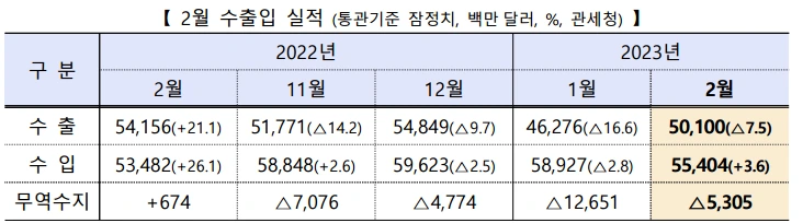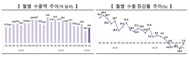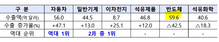 특히, 우리 최대 수출품목인 반도체 수출은 전년동월비 약 △44억 달러 감소(△42.5%)하면서 ’23.2월 수출 감소(△41억 달러)에 크게 영향