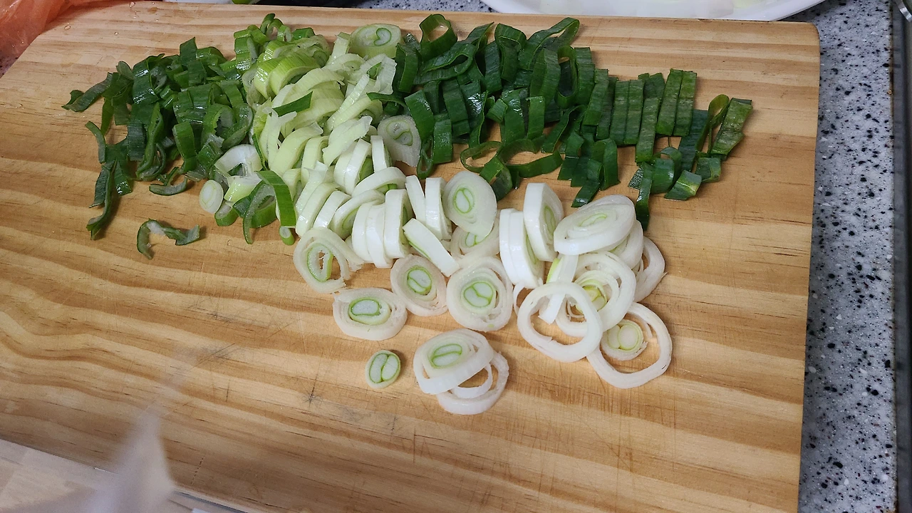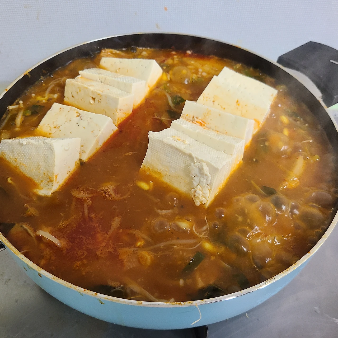 받아온 매운탕 거리에 대파 고추 콩나물 미나리 두부 듬뿍 투척