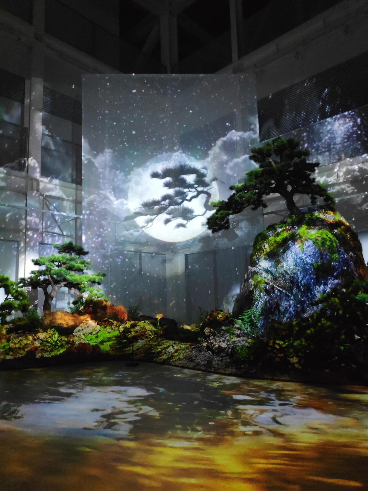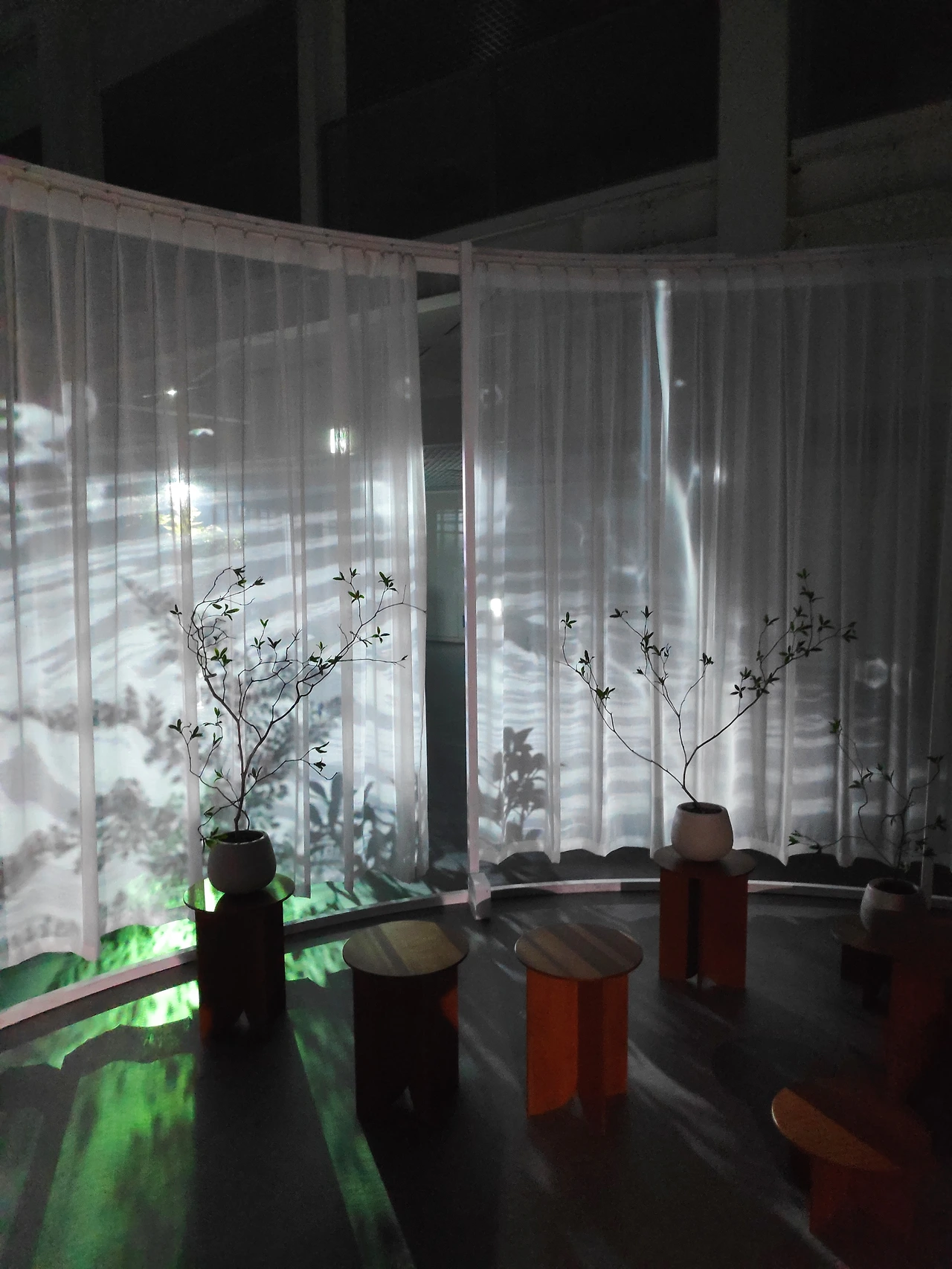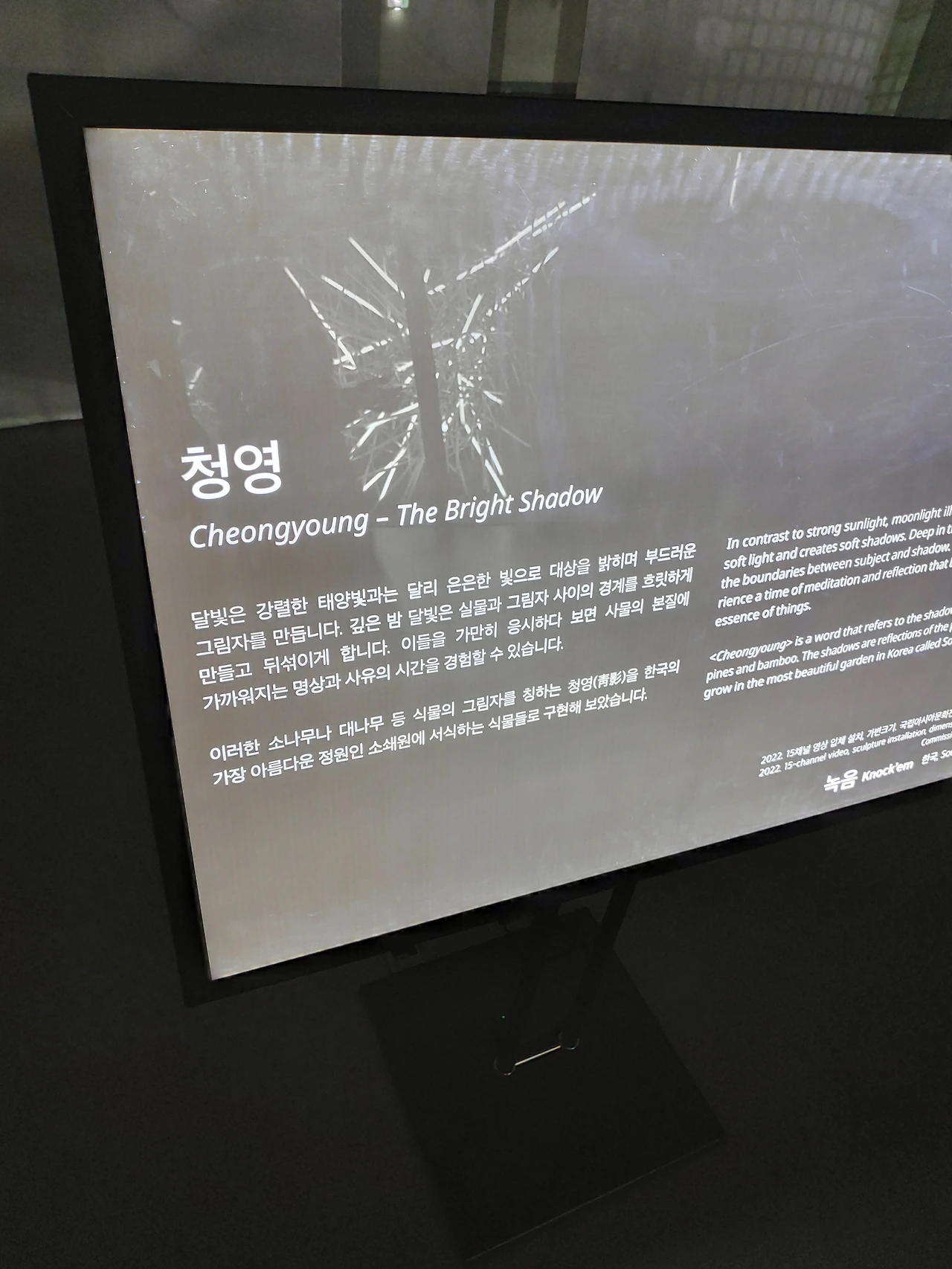 작가는 자연과 영상이 하나가 되어 천천히 거닐 수 있는 가상의 정원을 만들었습니다. 처음 마주하게 되는 그림자 정원과 공간에 흩뿌려진 영상작품은 미처 발견하지 못했던 자연의 고유 형태들과 움직임을 단순한 그림자로 표현합니다. 작품 속 그림자는 빛의 반대 개념인 어둠이 아닙니다. 생명을 가득 품고 있는 무한한 공간입니다. 그림자를 가만히 응시하다 보면 사물의 본질에 가까워지는 시간을 경험할 수 있습니다. 자연의 모습들이 빛을 받아 인간이 만든 구조물에 그림자를 드리웠을 때 비로소 인간과 자연이 소통하게 됩니다. 그림자 정원을 지나면 아름다운 보름달이 떠 있는 또 하나의 정원을 마주하게 됩니다. 밤이 깊어질수록 달의 형태가 변하고 달의 형태가 변할 때마다 그 불변의 숲과 천도 계속해서 새로운 모습을 보여줍니다. 자연으로 떠나기 어려운 현대인들이 소쇄원의 시처럼 바위에 누워 푸른 하늘에 밝은 달을 감상할 수 있도록 고요한 밤산책의 경험을 선사합니다. 이제 상상너머를 거닐고 온 사유정원의 마지막 여정을 즐겨보세요.