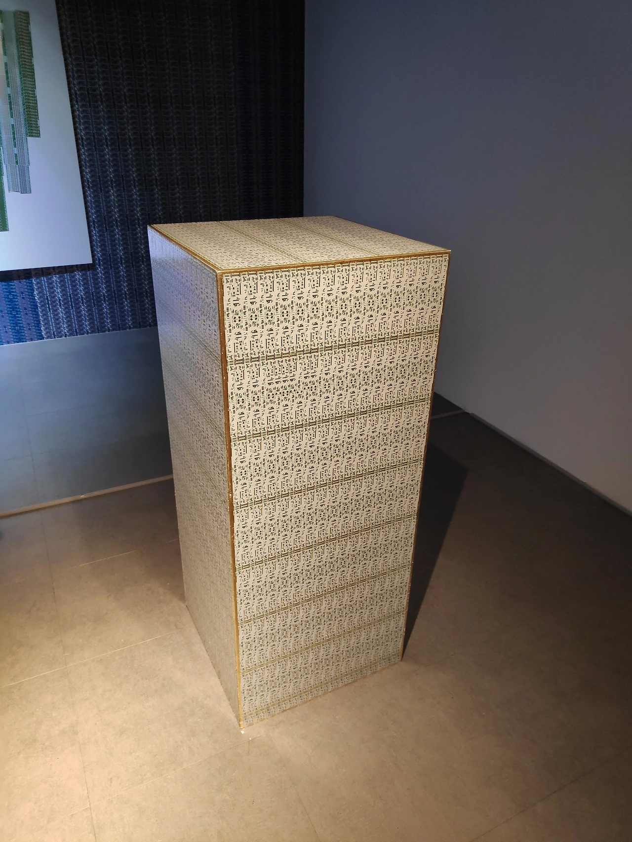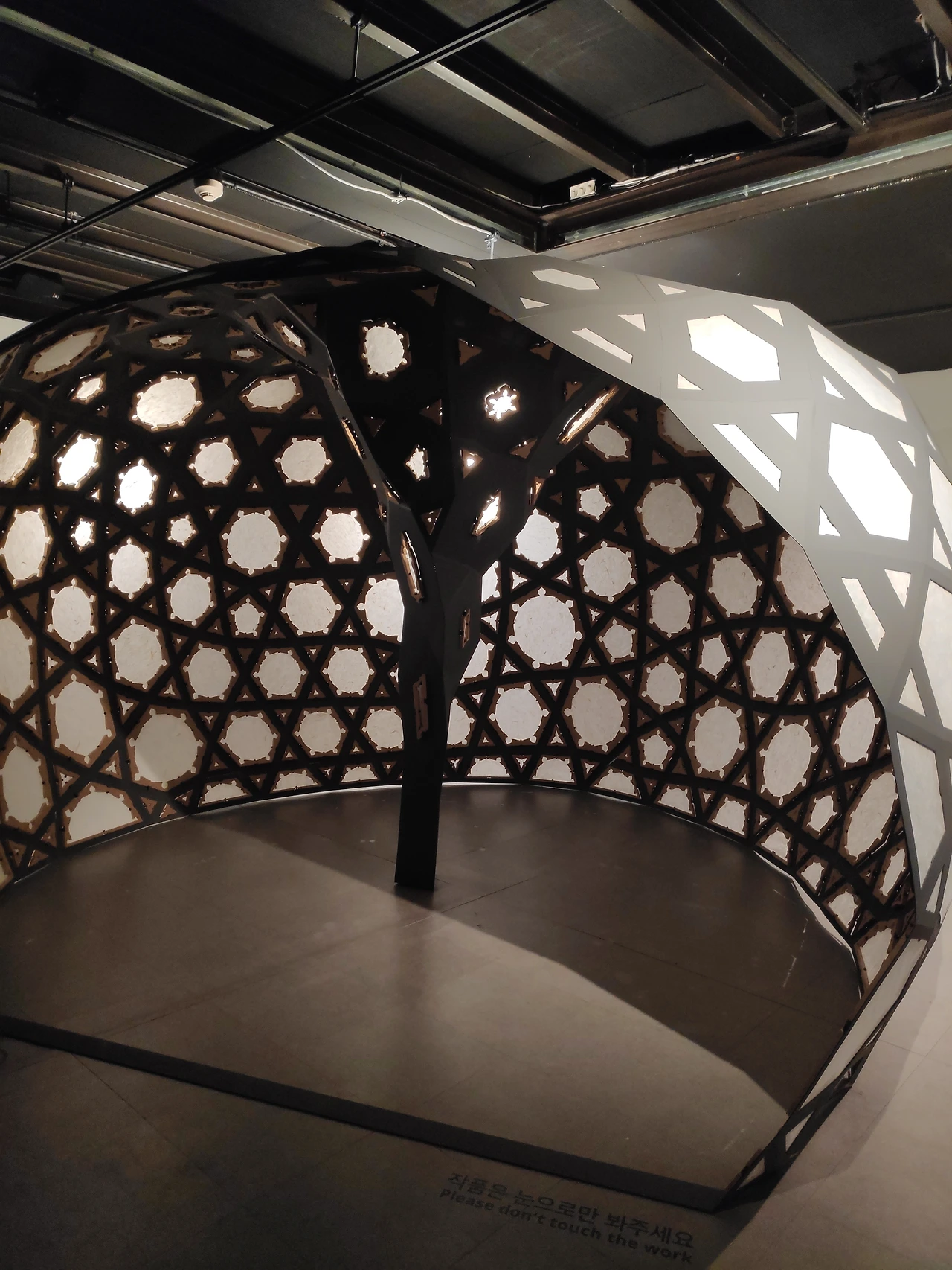 이 작품은 수백 개의 다각형과 삼각형을 3차원 알고리즘을 통해 재배치하여 기둥과 벽체가 하나가 되도록 만들었습니다. 하나의 수식에서 만들어지지만 임의의 변수 값에 따라 분화된 이 도형들은 놀랍게도 같은 모양을 가진 것들이 없습니다. 이 작품은 안과 밖, 전통과 첨단 사이 모호한 경계를 새로운 시각으로 경험하게 합니다. 나아가 창호를 투과하여 내부 공간에 드리우는 빛은 개방성과 폐쇄성이 공존하는 안과밖의 이중적 성격을 동시에 보여줍니다. 안과 밖은 언제나 바뀔 수 있습니다.