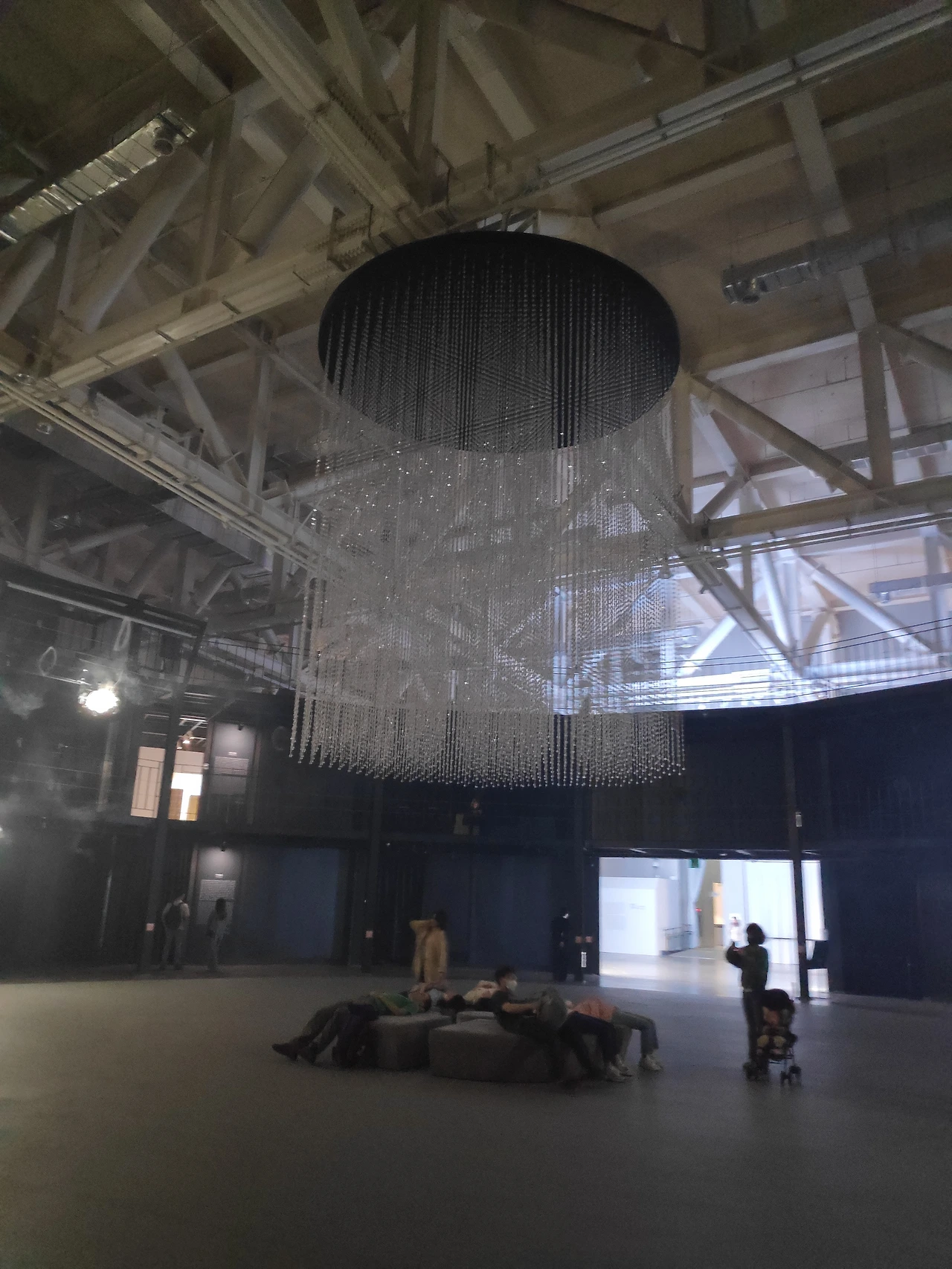영원의 집 문턱에서 / A.A. 무라카미수많은 안개링이 빛과 함께 공간의 중앙을 향해 움직이다가 LED 샹들리에를 만나 흩어지고 사라지는 <영원의 집 문턱에서>는 기운과 인간의 상호 관계를 담고 있습니다. 모든 물질의 근원인 '기'는 눈에 보이지 않지만 이 공간에서는 보고 만지며 느낄 수 있습니다. 이 작품은 기계와 프로그래밍으로 구현됩니다. 특수 제작된 기계장치는 인체에 무해한 성분의 용액으로 안개링을 생성하고, 프로그래밍은 안개링의 농도와 속도, 움직임을 제어합니다. 그리고 관람자는 안개링을 만지고 체험하며 '기'와 교감합니다. 작가는 중앙의 소파에 누워 명상하듯이 작품을 감상해 보라고 권합니다. 우리는 이 공간에서 안개링을 통해 어린 시절 동심의 세계로 돌아가서 '기'를 만지며 생동하는 기운을 얻게 됩니다.