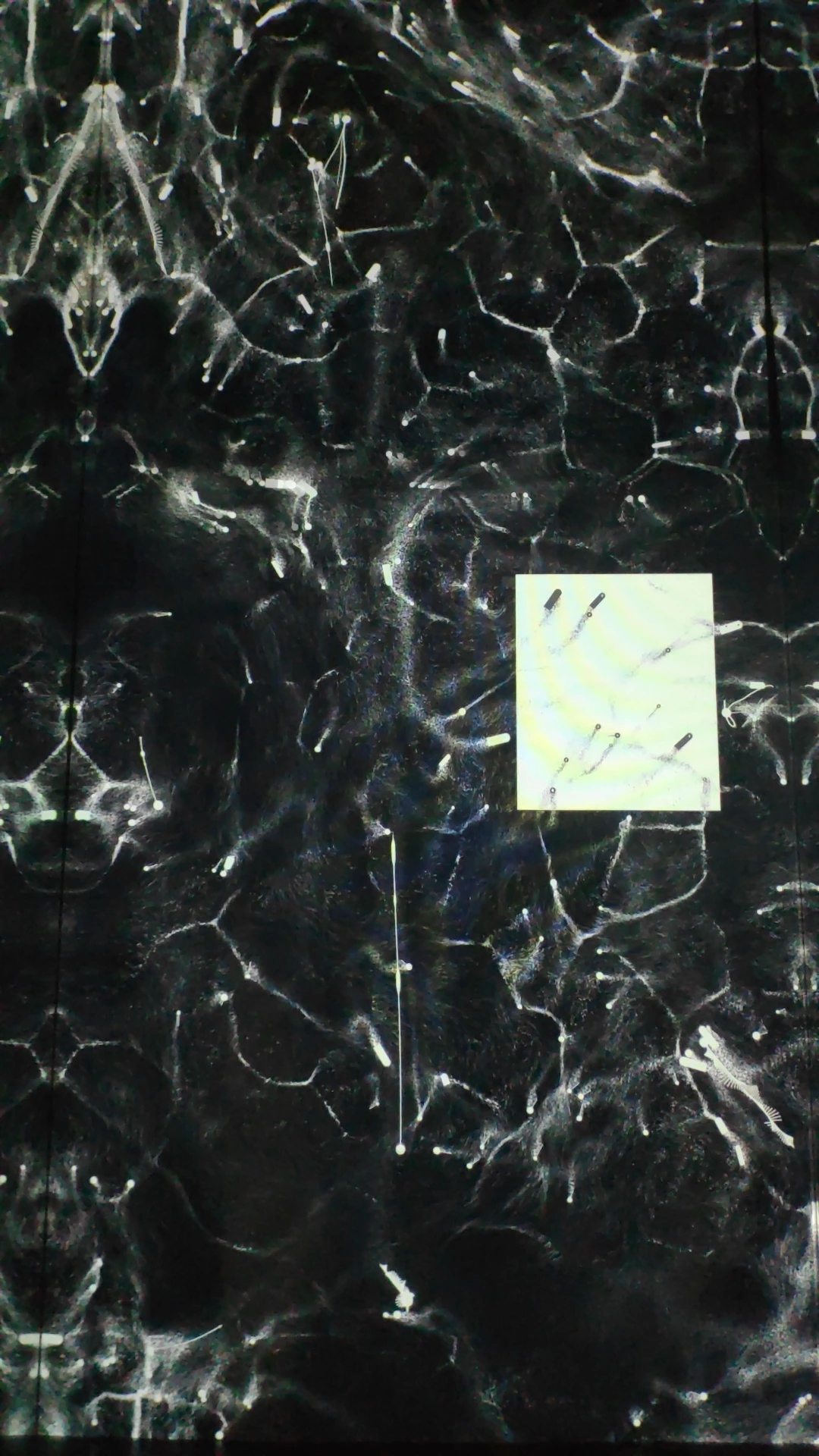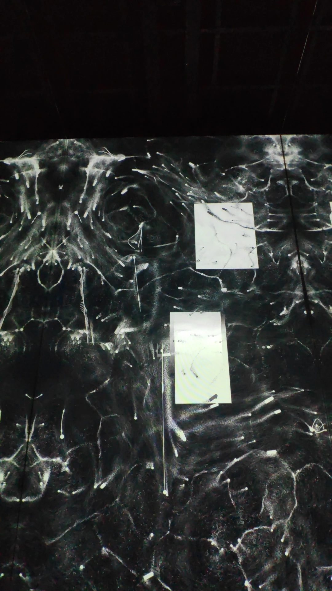 소리 오브젝트를 위한 구성 제7번 / 고휘스스로 움직이는 소리의 모양들이 관람자와 교감하며 '소리로 이루어진 생태계'를 만드는 작품입니다. 어두운 공간으로 들어가면 음의 높낮이, 음색, 음량등의 정보가 담긴 추상적인 도형의 모습을 한 '소리 오브젝트'가 화면에 떠돌아다닙니다. 이 소리 오브젝트는 관람자와 상호작용하며 다양한 흐름을 만들어 냅니다. 또 화면에 자리를 옮기며 등장하는 하얀 사각형은 그 테두리 안에 들어오는 소리 오브젝트를 읽어 소리가 울려 퍼지게 합니다. 고정된 음표로 이루어진 오선지 악보와는 달리, 스스로 움직이는 소리 오브젝트들의 흐름은 거울을 통해 무한히 확장되는 악보가 됩니다. 관람자는 중앙에 설치되어 있는 태블릿 화면을 조작하여 실시간으로 소리 오브젝트의 흐름을 바꾸며 소리로 이루어진 생태계를 마주하게 됩니다.