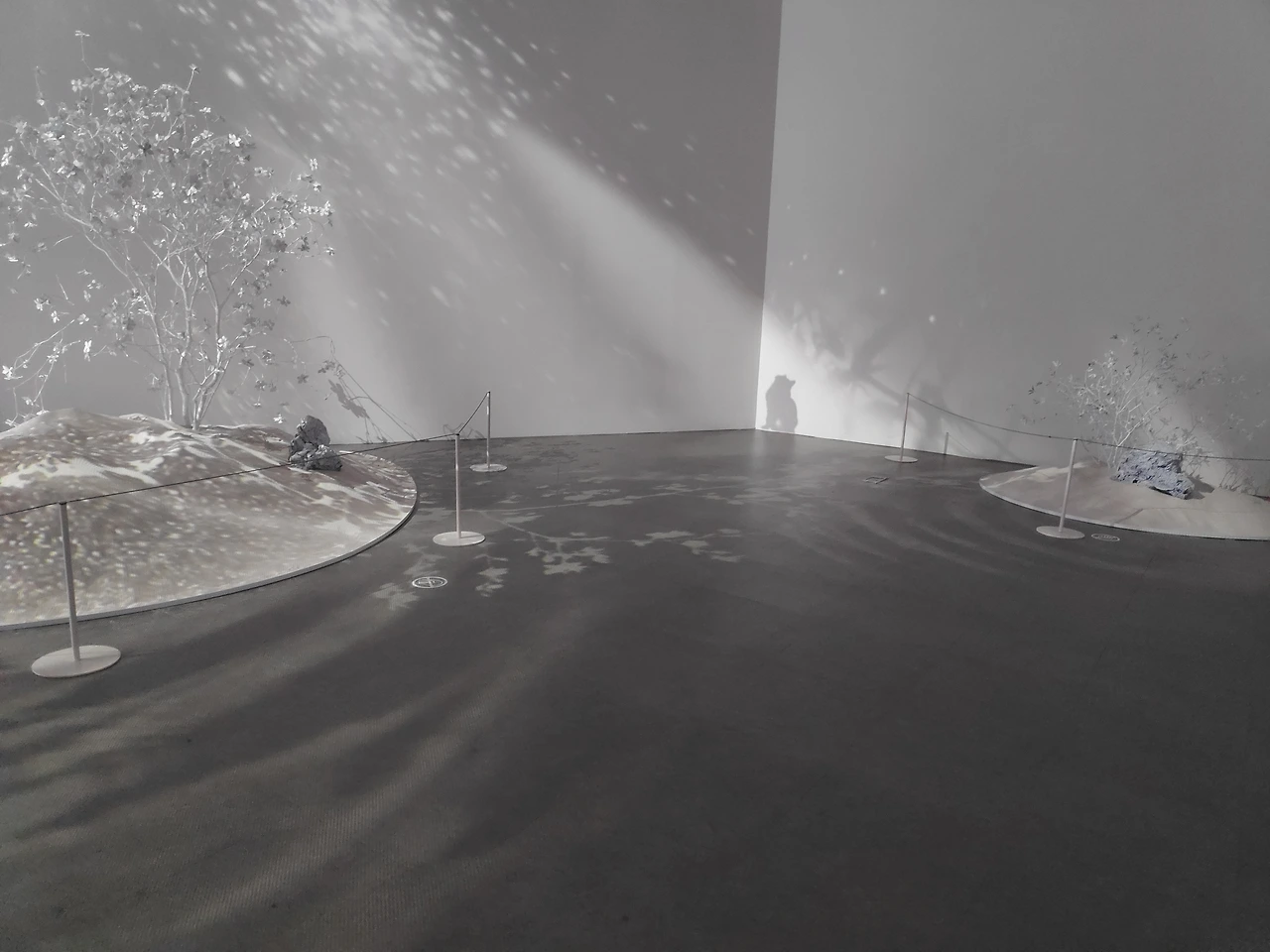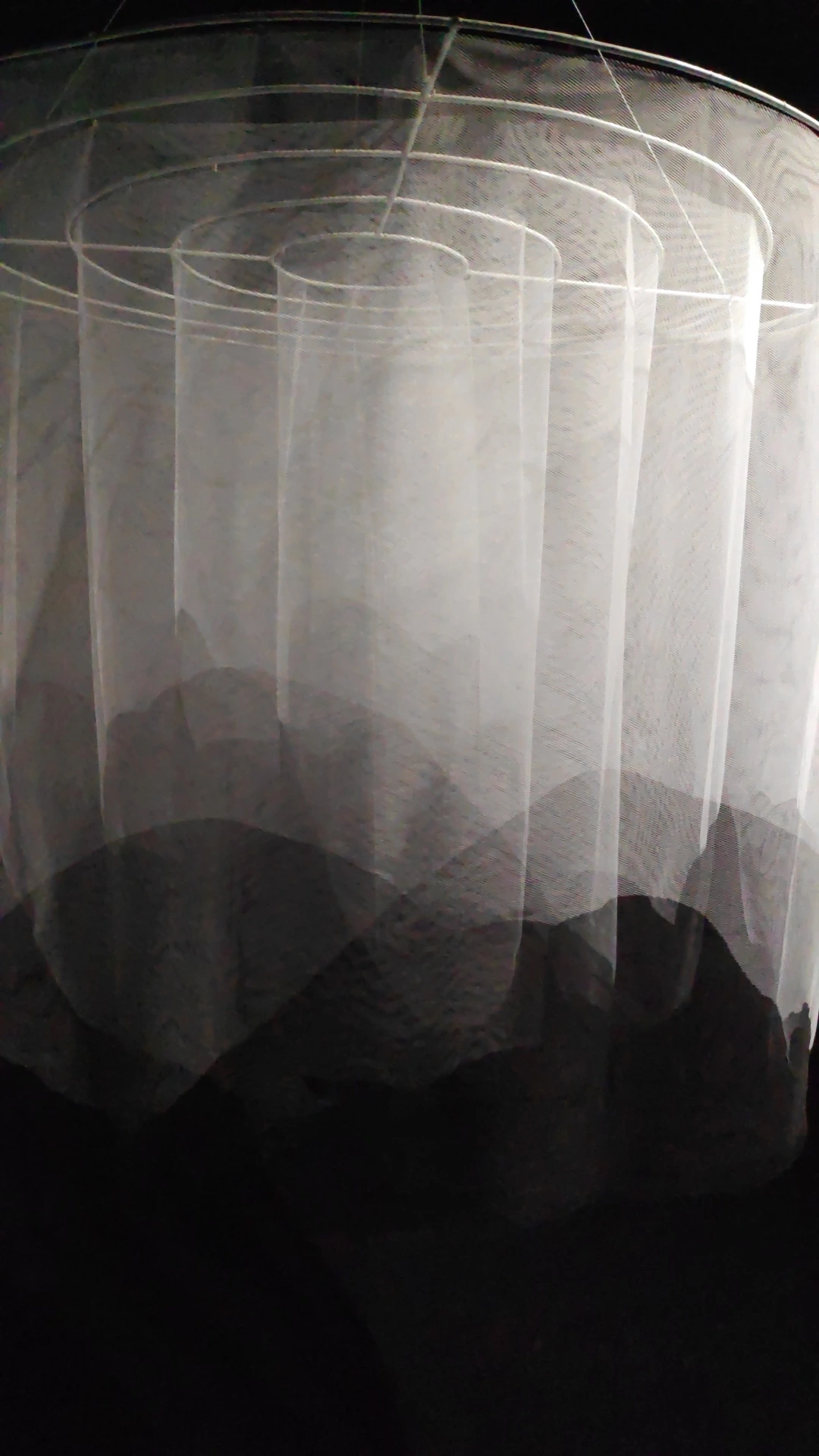 산 바라보기 / 피아만나코산 바라보기는 차분하고 잔잔한 풍경화를 선사합니다. 튤 섬유와 잉크를 이용해 여러 가지 자세로 누워있는 몸의 그림자를 그리고, 산 바라보기 2 는 여러 가지 모양을 하고 있는 손의 그림자를 만듭니다. 작품 속 그림자들은 하나로 합쳐지며 산과 들의 풍경처럼 연출되고, 몸과 손 그림자들은 켜켜이 겹쳐지며 풍경 속 언덕과 계곡의 모습을 형성합니다. 몸과 손의 이미지가 겹겹이 표현된 섬유는 안쪽에 자리 잡을수록 그 색깔이 점점 옅어집니다. 이는 마치 실제 자연경관에서 멀리 있는 산일수록 그 모습이 희미하게 보이는 것과 같습니다. 작품 속 검은색과 하얀색은 마치 음과 양의 개념처럼 서로를 보완하며 보기 좋게 어우러집니다. 관람자는 어두운 공간에서 천천히 돌아가는 작품을 마주하며 산과 들의 자연경관을 먼저 바라보고, 어느 정도 시간이 지나고 나서야 그 안에 숨어있던 형상들을 인지할 수 있게 됩니다. 익숙한 것을 자세히 볼 때 다른 것을 발견할 수 있습니다.