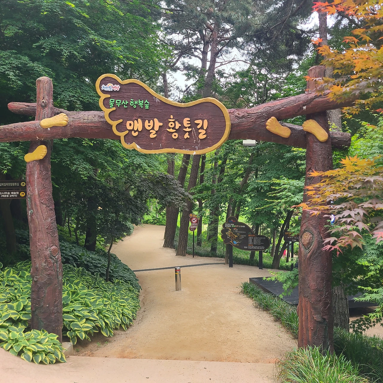 한국관광공사 비대면 관광지로 선정된 물무산 행복숲은 숲속둘레길 10km, 질퍽질퍽 맨발 황톳길 2km, 유아숲체험원, 물놀이장, 편백명상원 2개소, 소나무숲, 예술원, 가족명상원, 하늘공원, 등산로 3.5km, 운동기구가 조성되어 있는 종합산림복지숲이다. 특히 물무산 뒷편에 위치한 맨발 황톳길은 황토의 건강함과 질퍽거리는 재미를 느끼며 힐링할 수 있으며 질퍽한 황토길 0.6㎞와 마른 황톳길 1.4㎞로 구성되어 이용자의 편의에 따라 맨발로 질퍽한 길과 마른 황토 길을 선택하여 걸을 수 있다.