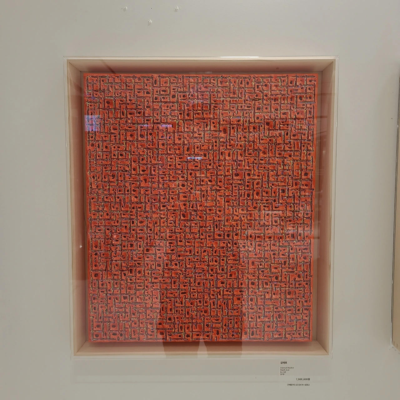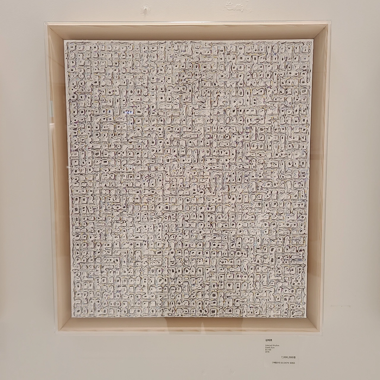 김태호의 단색화 작품들은 ‘내재율(Internal Rhythm)’이란 명제하에 캔버스 격자 문양을 배경으로 캔버스를 직각으로 무수히 돌려가며 가로세로 겹겹이 물감을 올리는 창작행위의 결과물이다. 동양의 정신성과 사유, 서양의 물질성과 감각이 그 작품 안에 담겨 있다. 완성 작품에 존재하는 색과 형은 작가의 정신과 육체 그 자체이다. 무념무상과 인고의 창작 노동이다. 선과 색의 중첩으로 완성되는 무수히 많은 벌집 형상은 선(禪)의 정신세계에서 우주적 존재론으로 확장된다.