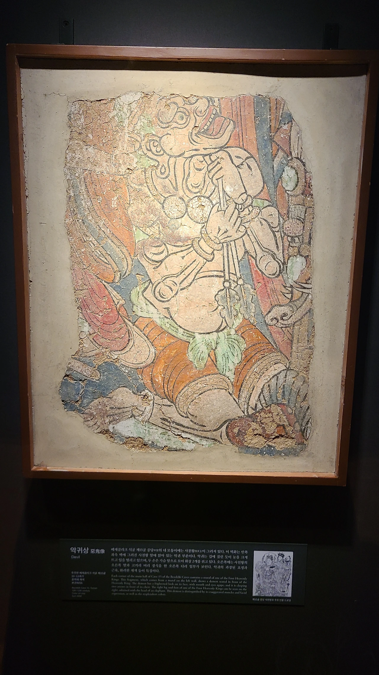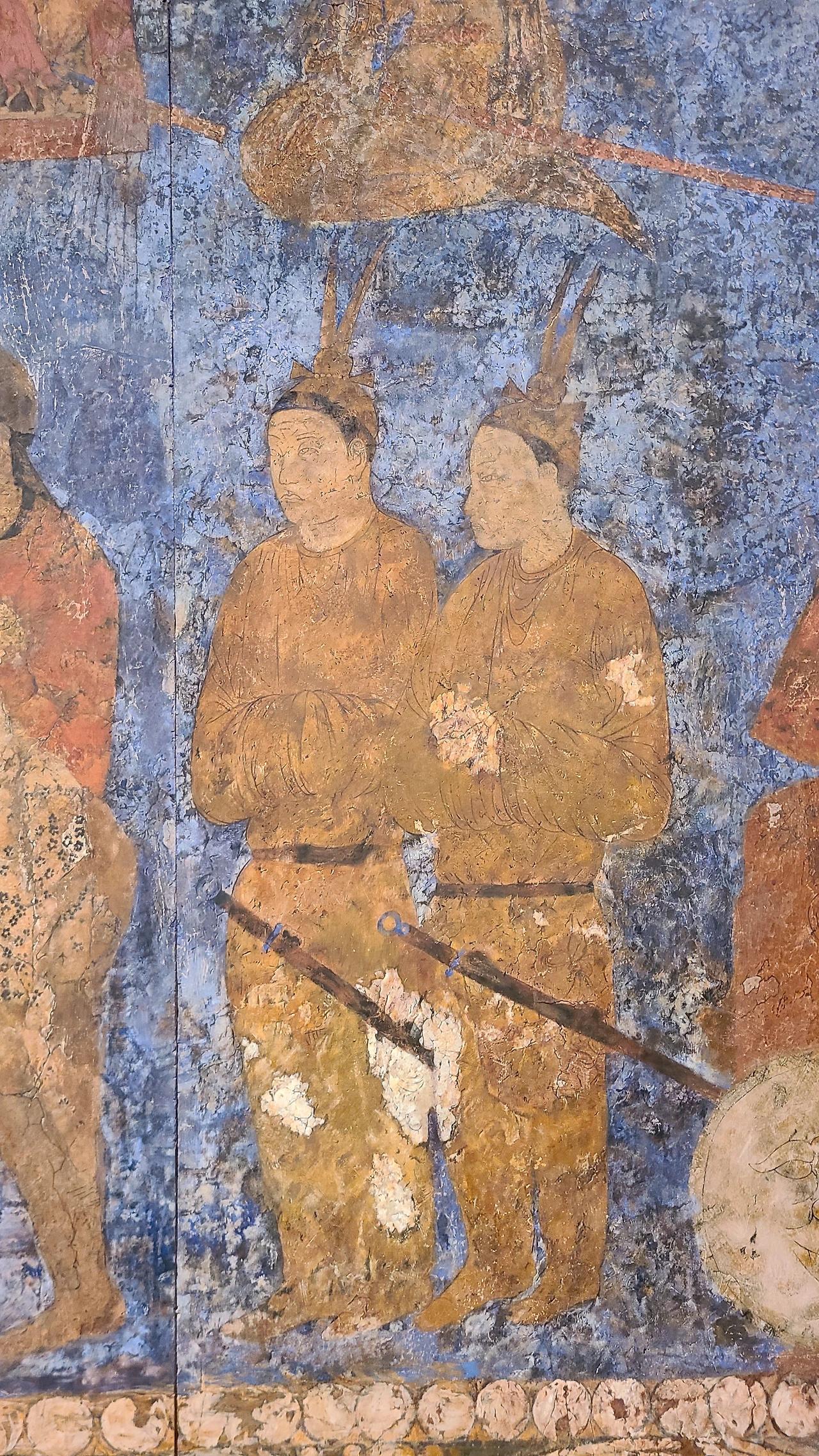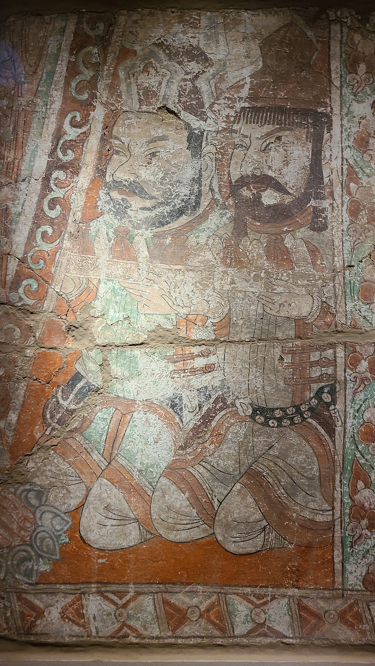 화려한 쟁반을 든 채 무릎을 꿇고 앉아 있는 두 사람의 개성 있는 얼굴과 복장에서 실크로드를 오가며 활약하던 상인의 모습이 연상됩니다.