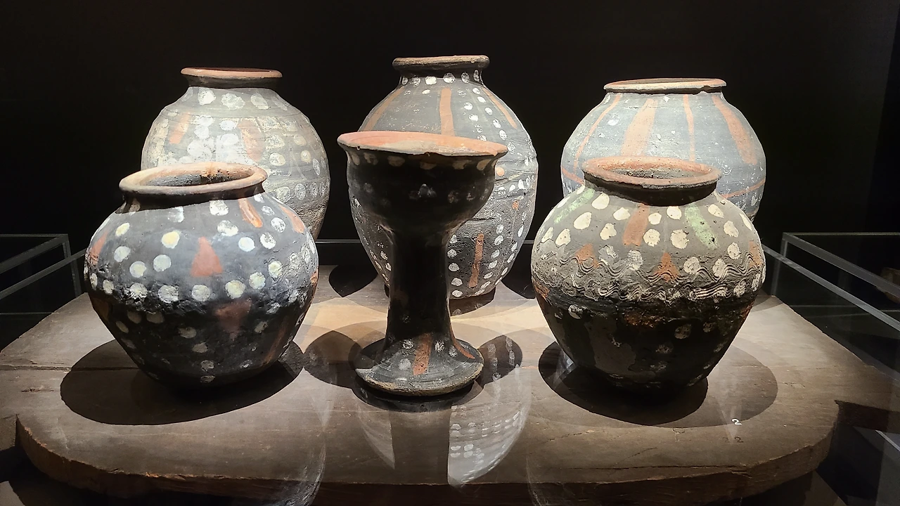 중앙아시아 로프노르 지역의 선사시대 유적인 샤오허 무덤에서 발견된 얼굴 조각입니다. 장례를 치를 때 사용한 물건으로 보입니다. 이 조각은 튀어나온 눈두덩과 작은 눈구멍, 높이 솟은 큰 코와 밖으로 드러난 이빨이 특징입니다. 나무로 만든 얼굴 겉면에 얇은 가죽을 붙이고, 그 주위에 붉은색과 자주색 물감으로 색칠을 했습니다. 눈은 돌로 만들어 붙였고, 이빨은 뼈나 상아로 만들었습니다.