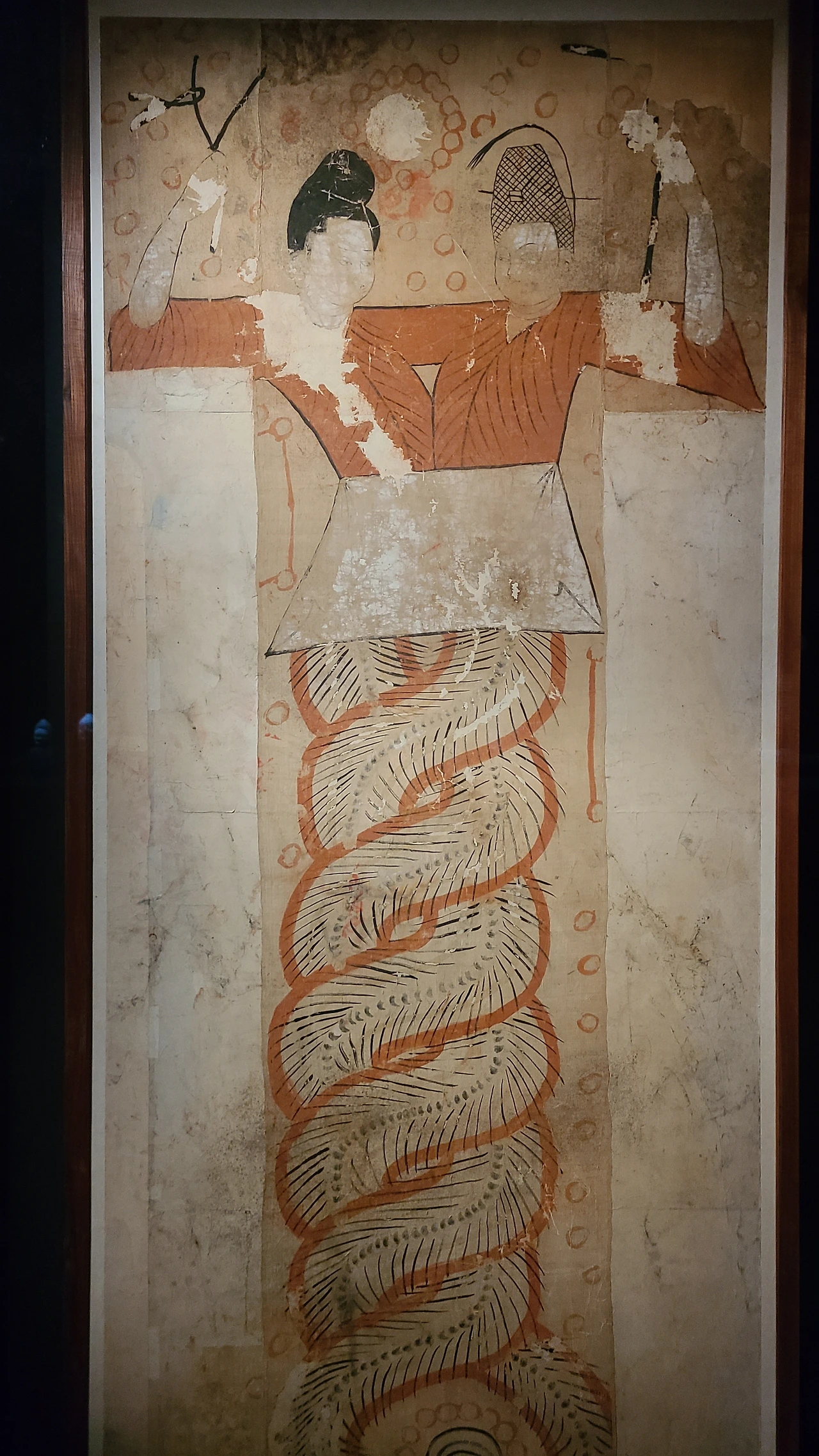 가운데 자리한 두 신은 상반신은 사람, 하반신은 뱀 모습이며 왼쪽이 여와, 오른쪽이 복희입니다. 각각 컴퍼스와 구부러진 자를 들고 있는데 이는 둥근 하늘과 네모난 땅으로 이루어진 우주관과 관련이 있습니다. 배경에는 해와 달, 별자리를 그려 하나의 소우주를 나타냈습니다.