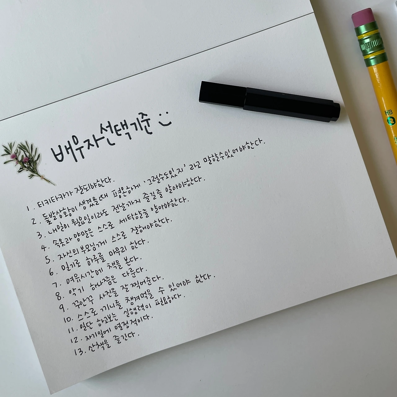 어쨌든 결혼생활도 10년의 세월이 흘렀다. 그리고 여지없이 남편에게 단단히 화가났던 어느날, 살아보기전에는 미쳐 알지 못했던 배우자 선택기준에 대해 기록했다. 화풀이로 써내려간 열 세가지 항목들을 SNS에 공유했다. 누군가 드라마속에서나 나올법한 인물이라 말했다. 그런가? 써놓고 보니 남편도 이중에 네개쯤은 속하는데 이정도면 괜찮은건가?" 묘하게 기분이 좋아지는 것 같았다.