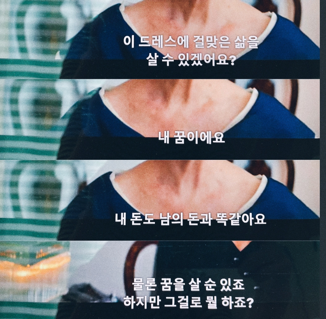 해리스 부인은 드디어 디오르 드레스를 살 수 있는 돈을 모으고 드레스를 사기 위해 파리로 떠났다. 파리에서 우연히 만난 디오르 직원과 모델이 함께하는 식사자리에서 대화를 나눈다. 그들이 나눈 대화들은 내 가슴을 한 번 더 요동치게 만들었다. 문득 '나는 주부인가 아니면 그 이상의 어떤 존재인가?' 나는 어떤 사람인가. 내 앞에 따라붙는 수식어들이 궁금해졌다.