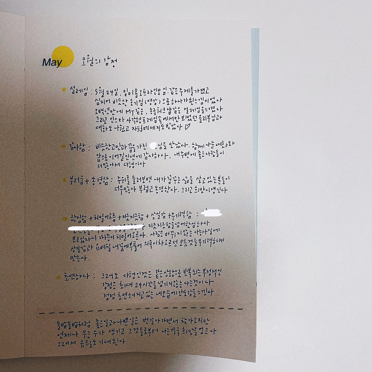 희망찬 오월이었지만 여지없이 부정적적인 감정들도 있었다. 그것도 이렇게나 많이 있었다. 똑같은 이유로 반복되는 부정적인 감정은 지긋지긋함과 동시에 반복으로 오는 상실감, 뭘 해도 변하지 않겠구나 싶은 좌절감에 무기력함이 동시에 찾아온다. 하지만 나에게는 이제 묘책이 있으니 상관없다. 긍정의 연료들을 채우면 된다.