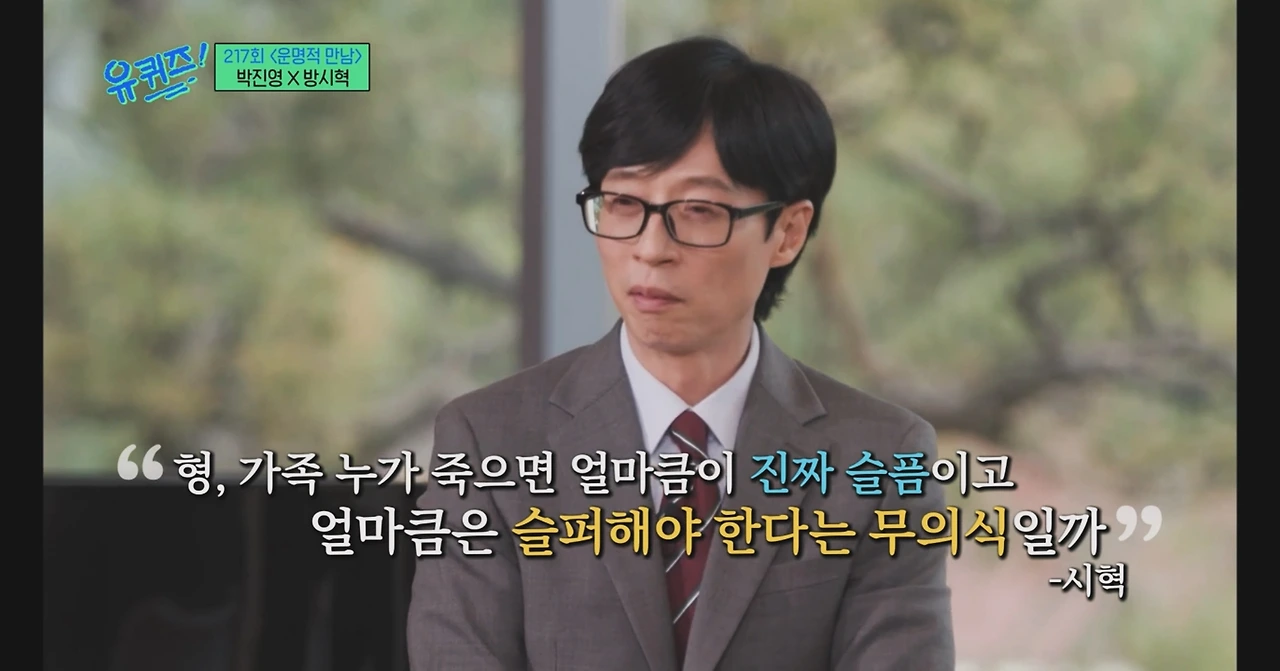 얼마전 <유 퀴즈 온 더 블럭>에 출현했던 방시혁 대표의 말이 떠올랐다. 가족의 죽음앞에 나의 슬픔은 얼마큼이 진짜 슬픔이고 얼마큼이 슬퍼해야한다는 무의식일까. 뜨끔하면서 공감이 되었다.