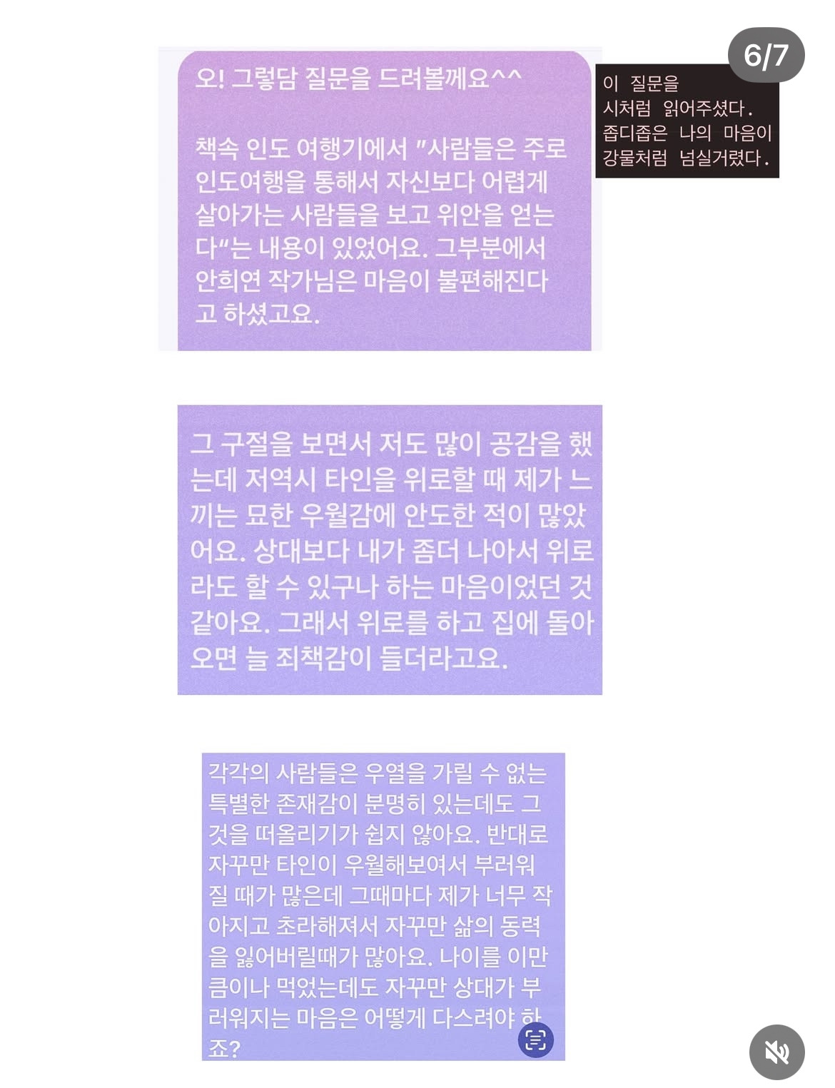 질문은 이런 것이었다. <줍는 순간> 에 나오는 인도 여행기에 “사람들은 주로 인도여행을 통해 자신보다 어렵게 살아가는 사람들을 보고 위안을 얻는다” 는 내용이 있었는데 그부분에서 안희연 시인은 불편감이 느껴진다고 했다. 그 구절을 보면서 많이 공감을 했었는데 나 역시 타인을 위로할 때 내가 느끼는 묘한 우월감에 안도한 적이 많았다. ‘그래도 상대보다 내가 좀 더 나은 상황이구나, 그래서 위로라도 할 수 있구나' 하는마음이 들어 우열을 가리는 것만 같아 죄책감이 들었다. 사람들은 모두 높고 낮음이 없는 각자 고유한 존재인데 매 순간 그것을 떠올리기가 쉽지 않다.