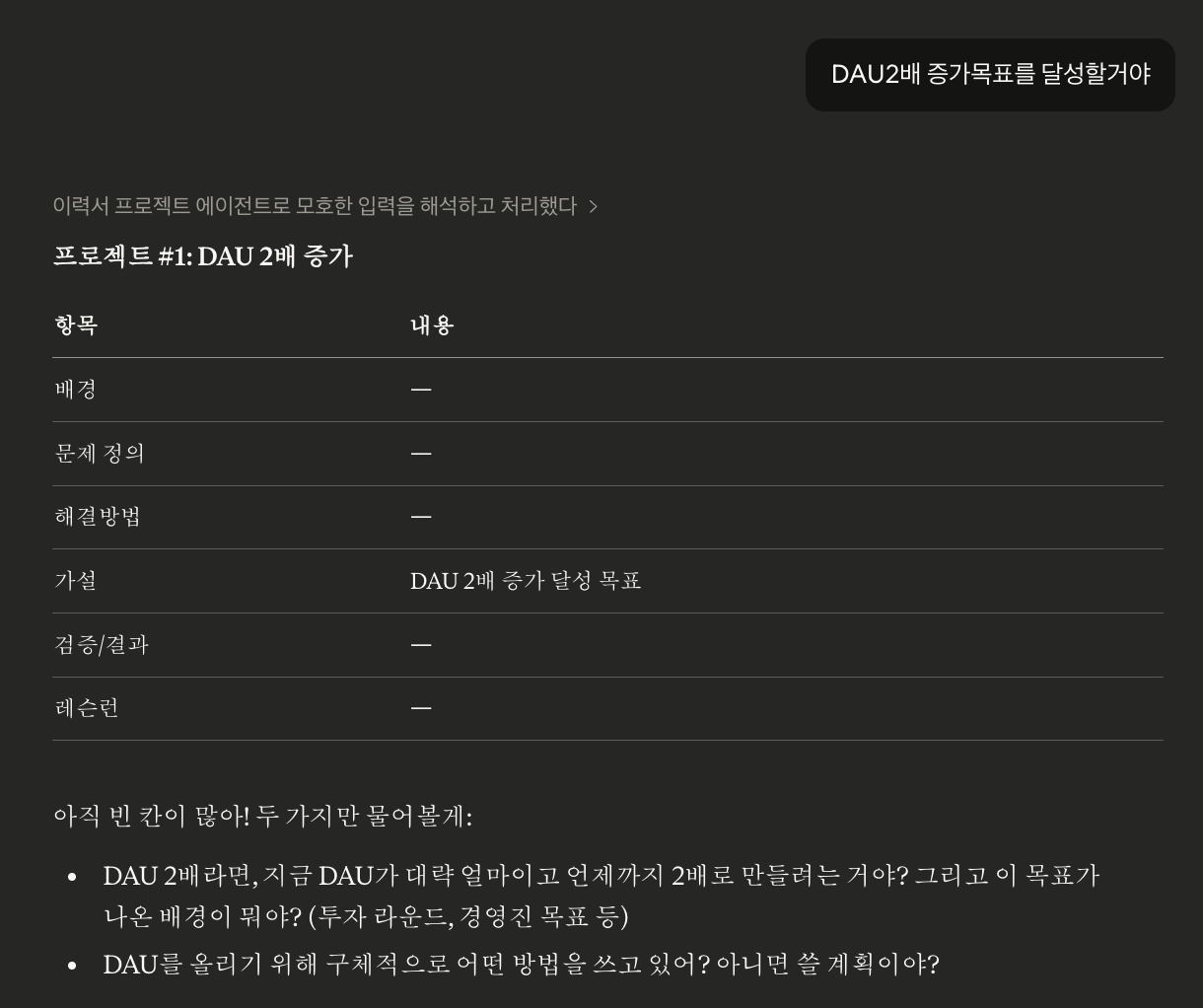 - 배경이 비었을 때 “그때 서비스 상황이 어땠어? DAU나 팀 규모 같은 맥락이 있어?”