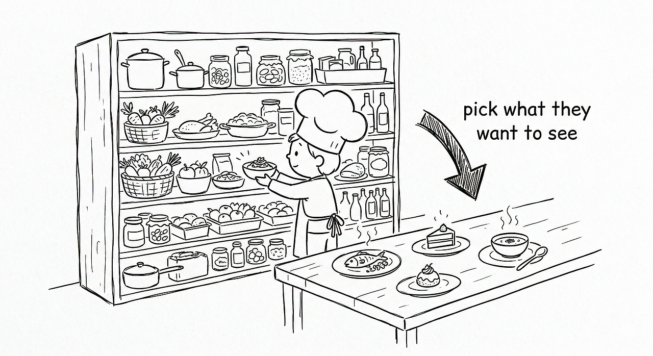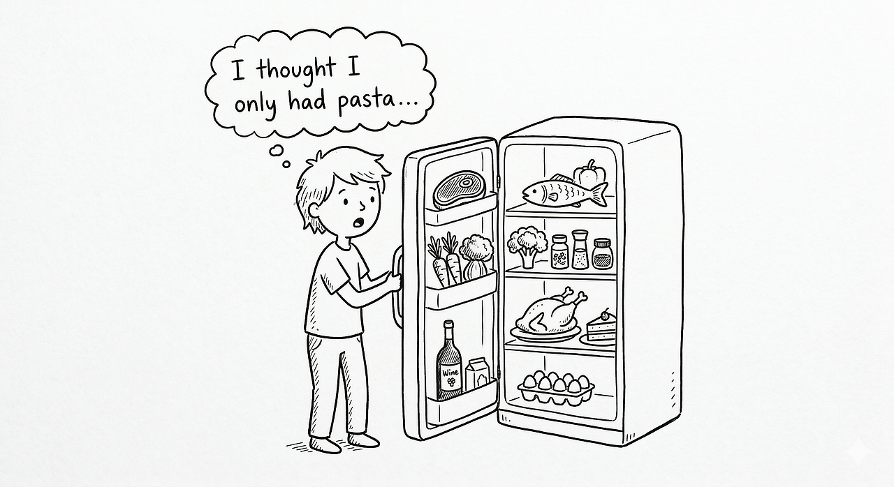 문제는, 대부분 자기 냉장고를 안 열어본다는 거다. 파스타만 만들어왔으니까 나는 파스타 재료밖에 없어라고 생각한다. 근데 막상 열어보면 예전에 스테이크 보조했던 경험, 디저트 시식하면서 쌓인 감각, 주방 동선 효율화했던 기억 다 재료다. 꺼내서 정리해놓지 않으면 코스를 짤 수가 없다.