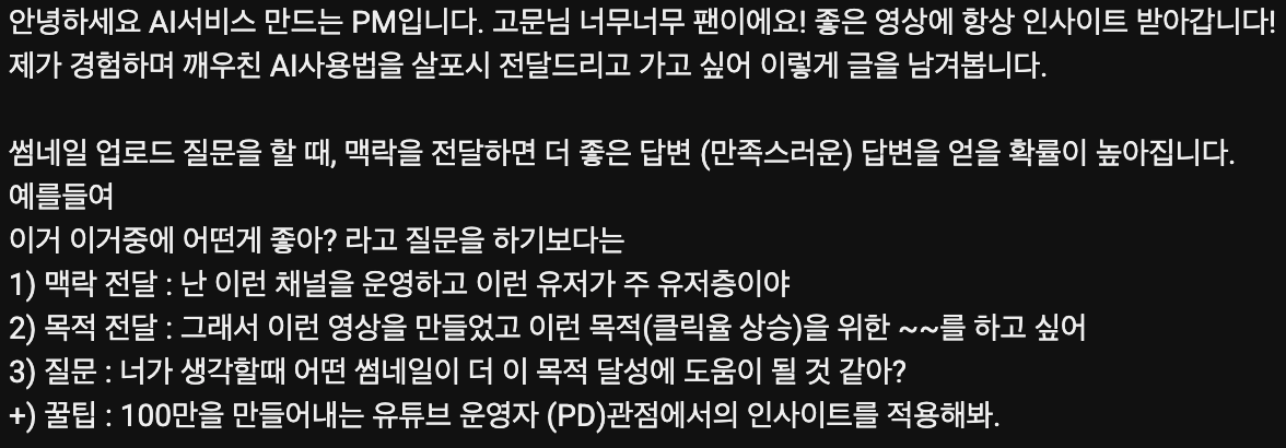유튜브에서도 채널 성격, 주 유저층, 영상 목적까지 같이 주면 답이 달라질 수 있다. 그리고 여기서 한 단계 더 갈 수도 있다. 최근 한 달 이 채널에서 클릭이 잘 된 썸네일. 타겟 유저 반응. 업계 벤치마크와 경쟁 채널 사례. 이런 것까지 같이 입력하면 답이 또 한 번 달라지는 경험을 했다. 물론 이건 어디까지나 내 경험이다. 오래 쌓인 사람의 감각을 AI가 대체할 수 있다는 얘기는 당연히 아니다. 다만 AI가 감각이 부족해 보이는 순간 중에는 맥락을 덜 준 경우가 있을 수도 있다.