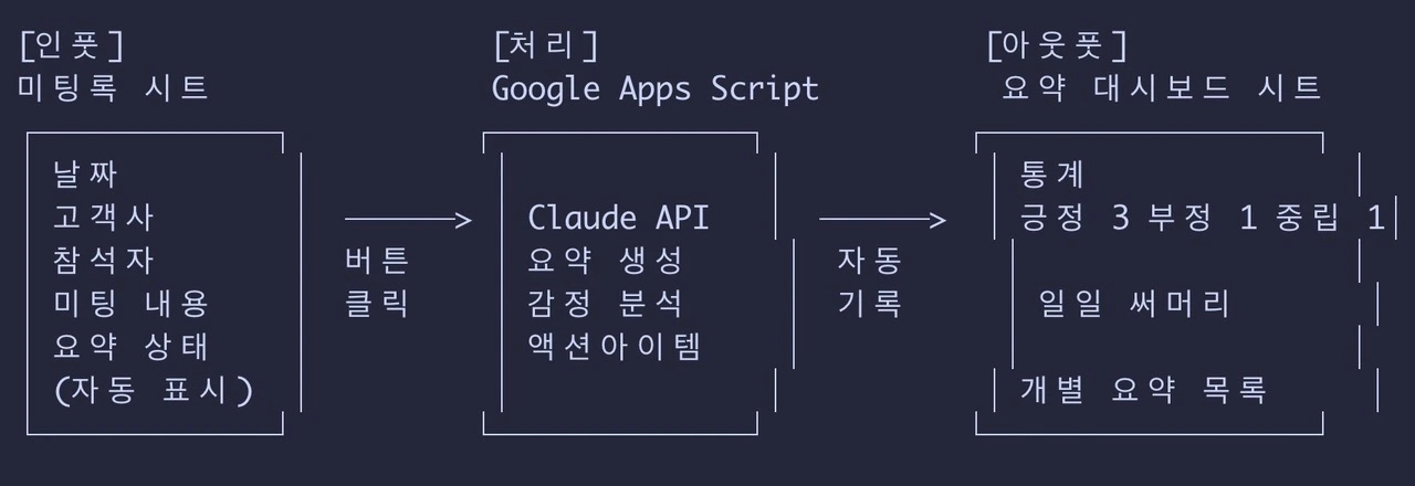 "미팅록 자동 요약 서비스 만들어줘. 구글 스프레드시트에 날짜, 고객사, 참석자, 미팅 내용 입력하면 Claude API가 3줄 요약 + 액션아이템 뽑아서 같은 스프레드시트 내 대시보드 시트에 자동으로 넣어줘. 감정 분석도 해서 긍정/부정/중립 태깅해줘."
