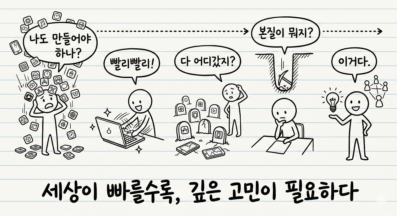 지금 AI 시대도 같은 흐름이다. 누구나 빠르게 만들 수 있고, 누구나 많이 만들 수 있다. 빨리빨리 만드는 것? 확실히 좋다. 아이디어가 있으면 바로 실행할 수 있다. 근데 그건 이제 누구나 할 수 있는 거다.