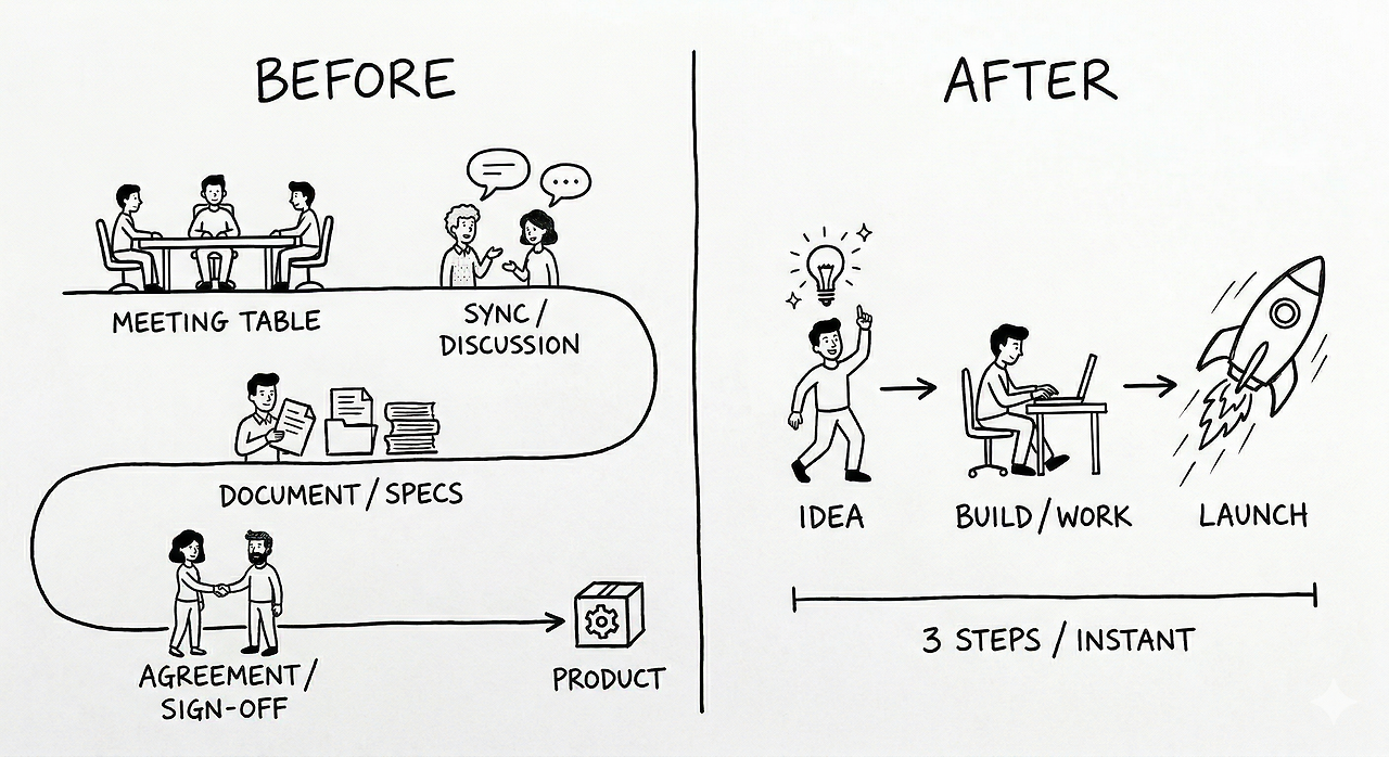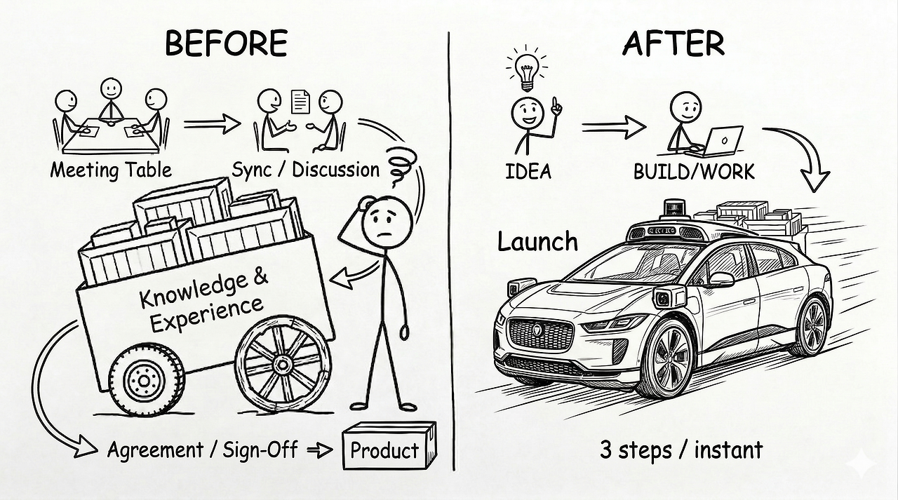 의견을 수렴하고, 조율하고, 정렬하는 비용이 비용이 0에 수렴한다. 한 사람이 생각하고, AI가 구현하고, 바로 검증한다. 맞춰줄 사람이 줄어들수록 속도는 올라간다. 이게 N배 성장이 가능해지는 구조다.
