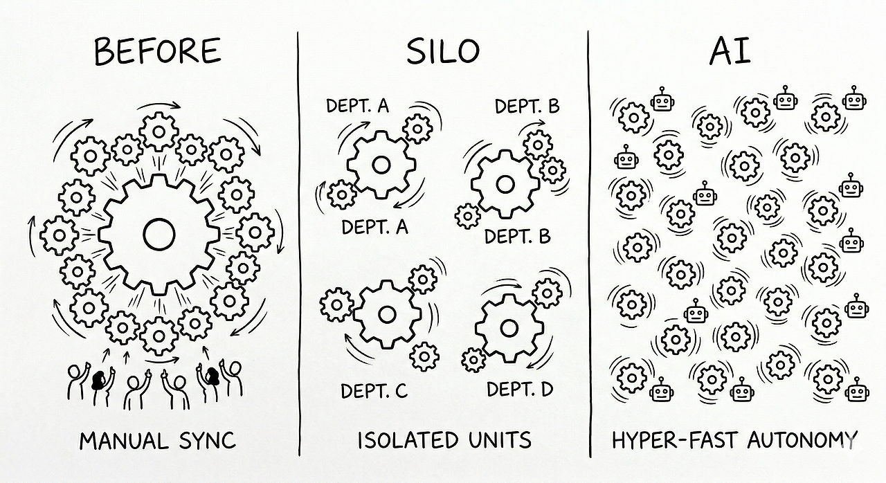 사일로가 의사결정 단위를 작게 만들었다면, AI는 팀 단위 자체를 작게 만든다. 2명 팀. 3명 팀. 극단적으로는 1명 팀.