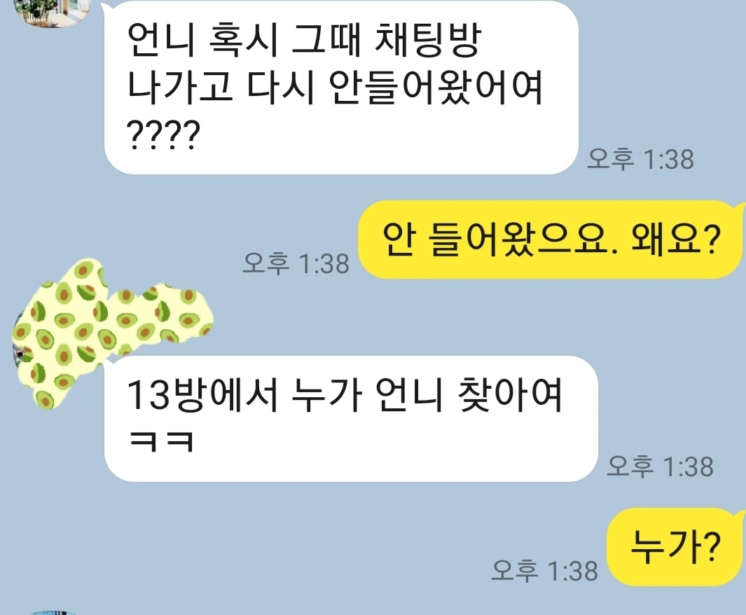 13년생 단톡방이 너무 시끄러워서 탈퇴한 지 꽤 됐다. 오늘 거기서 누가 날 찾는단다. 그 방에 있는 아는 동생이 개인 톡을 보내줘서 알았다. ,
