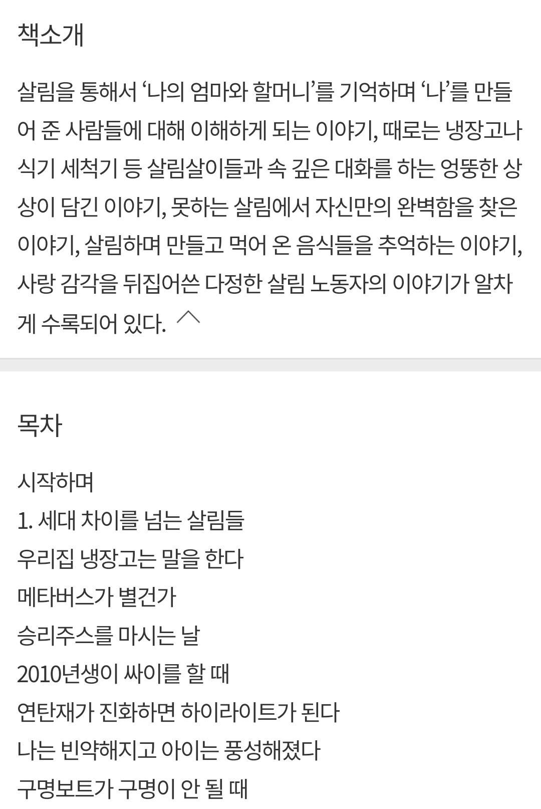 누군가가 이 책을 읽고 ‘못해도 잘한다.’의 마음을 가질 수 있다면.그래서 좀 더 자유로워질 수 있다면.이 책에는 살림을 통해서 ‘나의 엄마와 할머니’를 기억하며 ‘나’를 만들어 준 사람