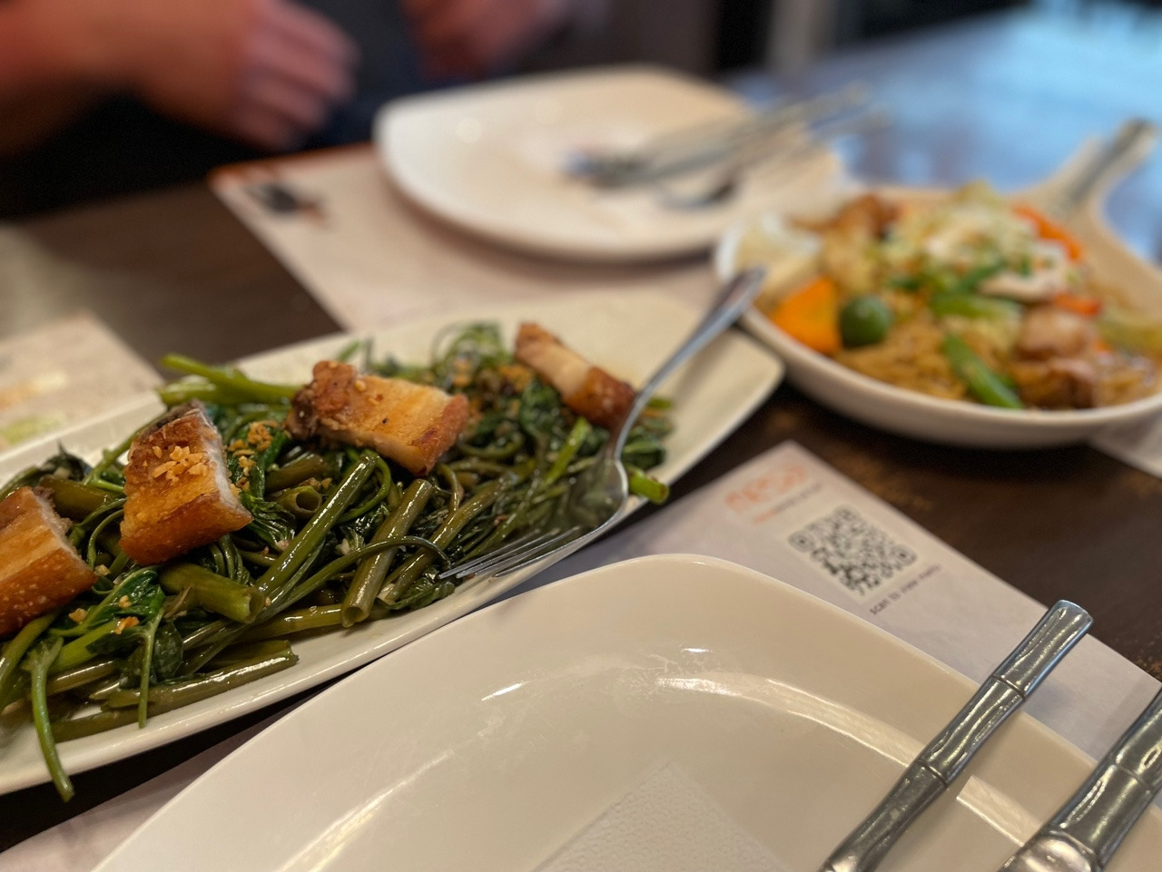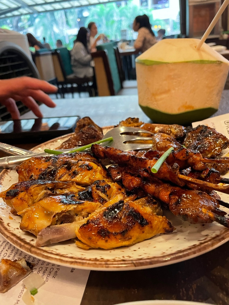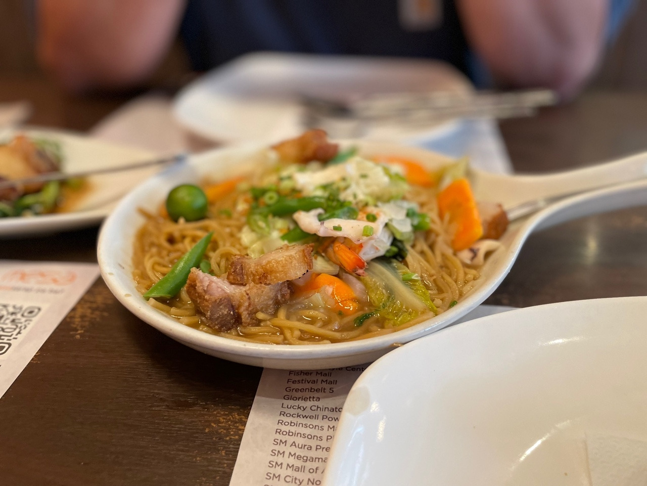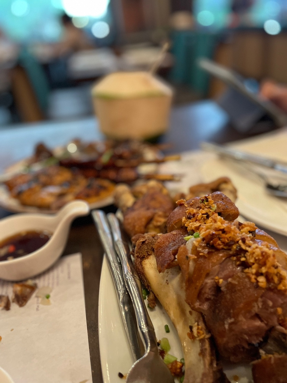 여러 가지 바베큐가 있는 all meat sampler, 깡꽁 레촌, 크리스피 본리스 파타, pancit canton 판싯칸톤(볶음면 요리)