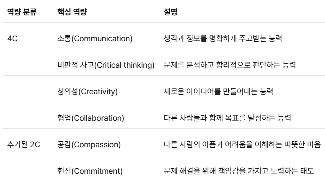 기존에는 미래 인재가 갖춰야 할 능력으로 4C를 많이 말해왔어. 소통, 비판적 사고, 창의성, 협업 이 네 가지지. 근데 폴킴 교수님은 여기에 공감과 헌신이라는 두 가지를 더해서 6C가 중요하다고 강조하고 있어. 아무리 똑똑하더라도 남을 배려할 줄 모르거나 책임감이 없다면, 오히려 위험한 리더가 될 수 있다는 거지.