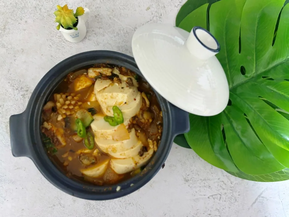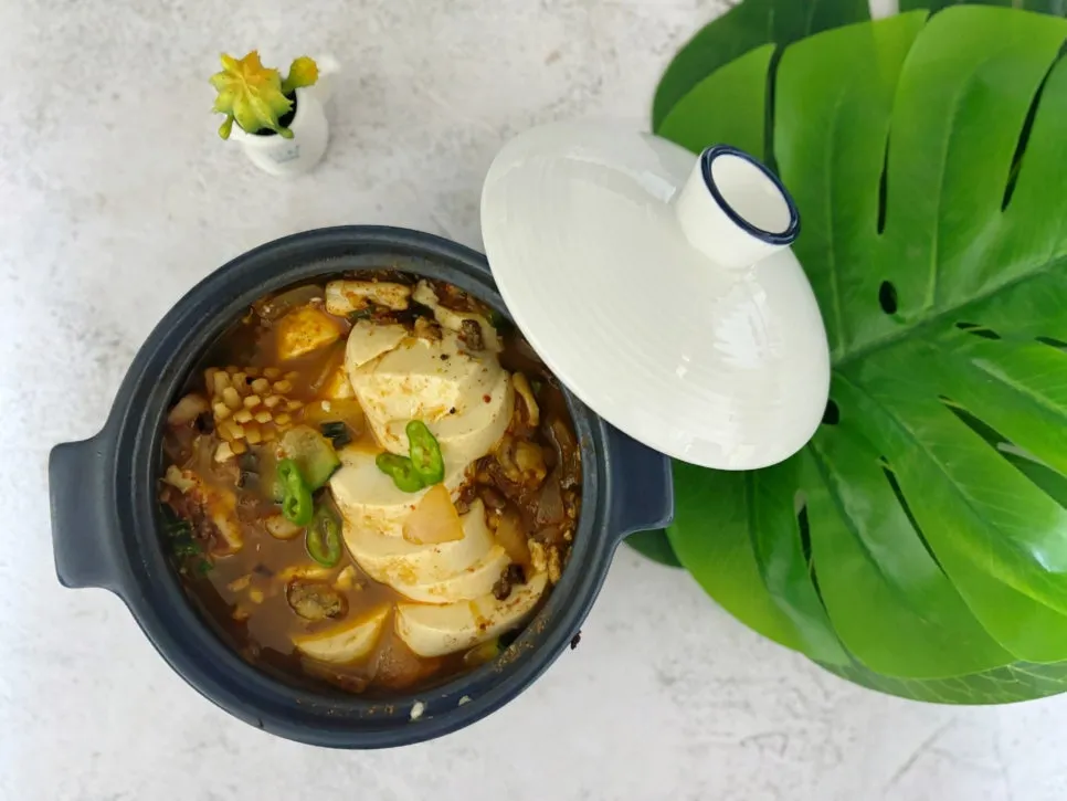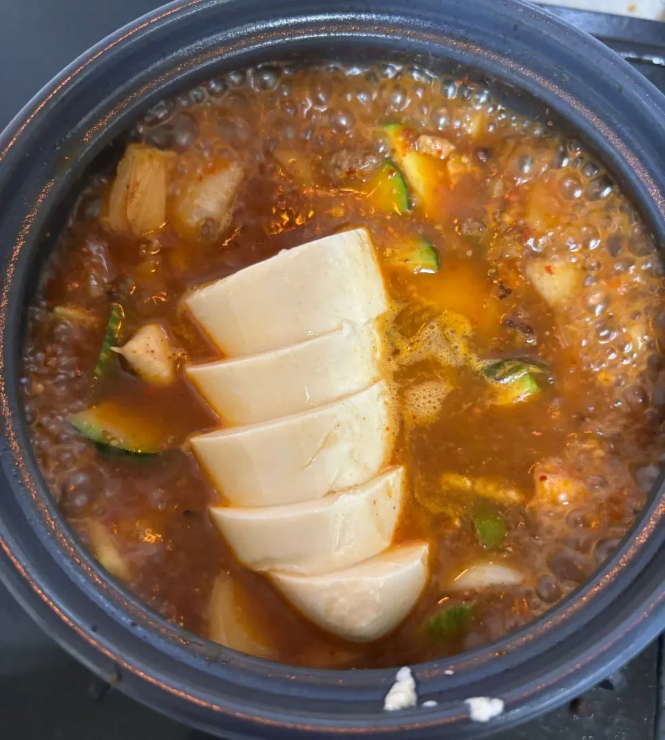 뚝배기에 육수가 끊으면 만들어둔 양념장과 야채, 순두부를 넣고 보글보글 끓여주면 완성이다.
