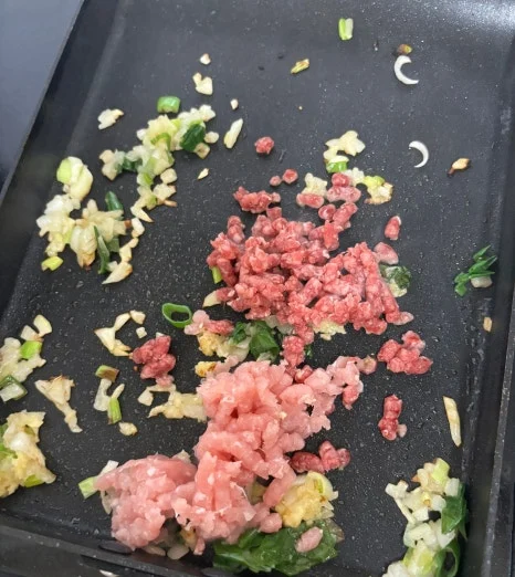 양파, 대파, 다진 마늘을 넣고 볶다가 돼지고기, 소고기 넣고 익혀준 후