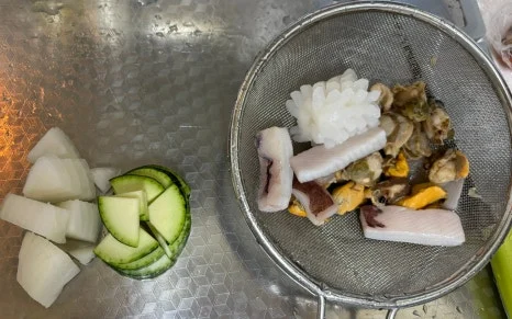 순두부찌개에 들어가는 양파, 호박, 해물을 준비하고