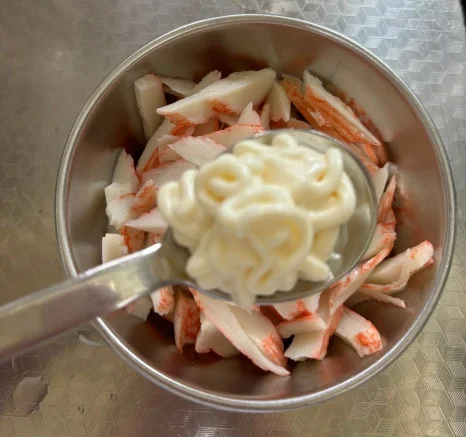 크래미를 칼로 썰었는데 다른 분 보니깐 포크로 결대로 긁어내서 쓰던데 이게 훨씬 좋은 것 같다. 손으로 찢으려고 보면 생각처럼 보슬보슬하게 나오지 않는다.