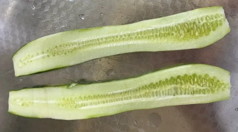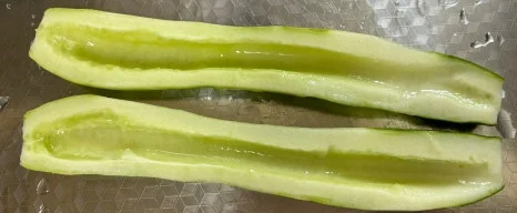 오이를 반 갈라 씨를 빼준다. 씨는 밥수저 말고 티스푼으로 하면 아주 잘 된다.