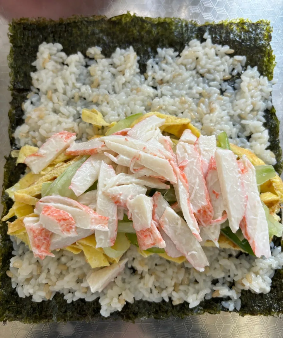 밥을 얇게 말고 내용물을 양껏 넣는다. 그리고 김 끝에 물을 묻혀 돌돌 말아주면 된다.