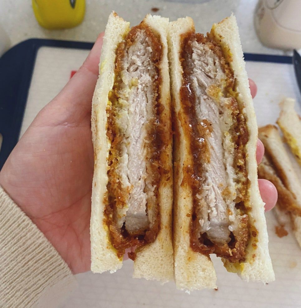 4. 소스 바른 식빵에 돈가를 넣고 반 갈라주면 완성이다.