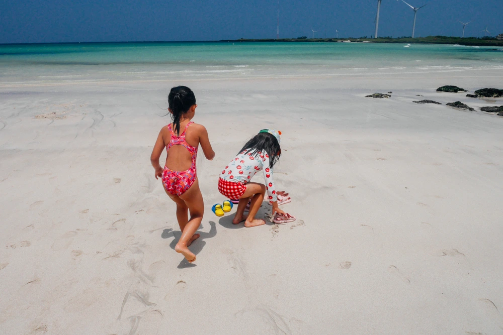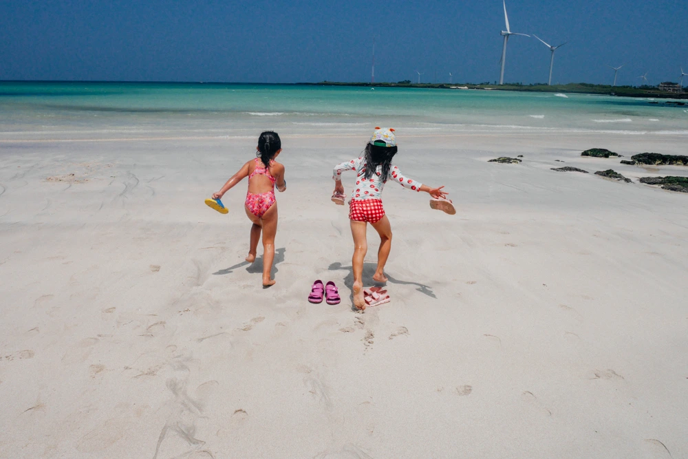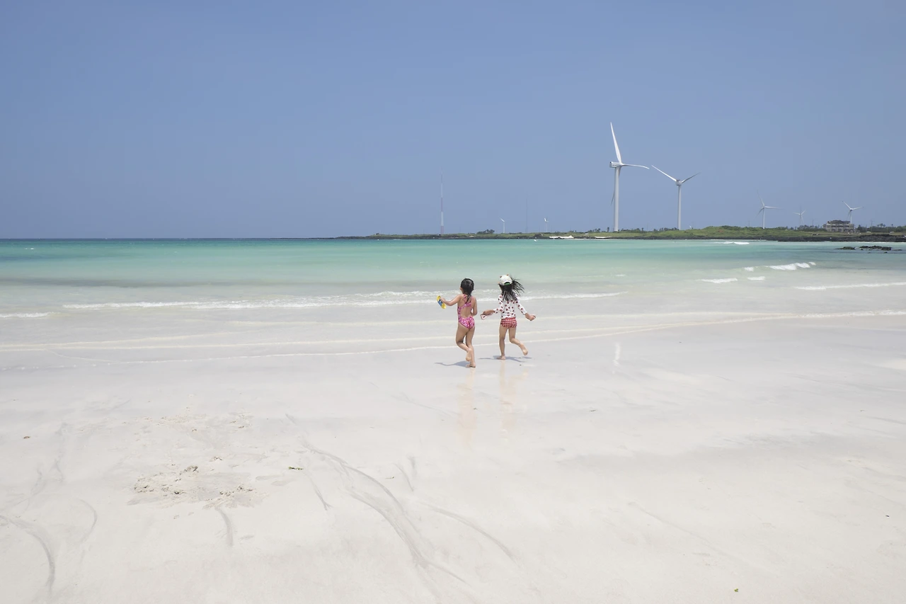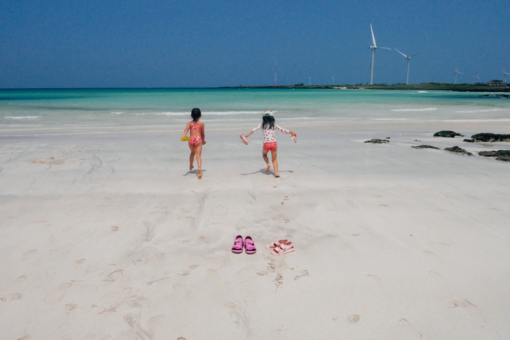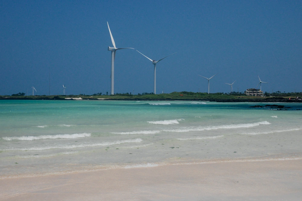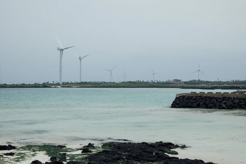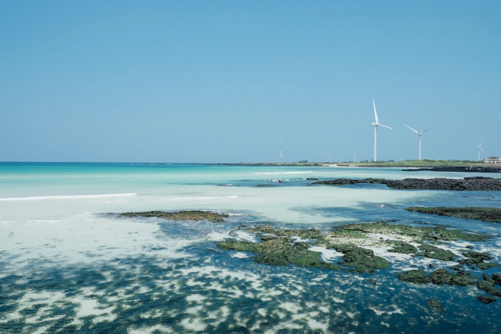 김녕, 생각만큼 깨끗했던 바다와 멀리서 돌아가는 풍력 발전기를 멍하니 보고 있으면, 도시에서 바쁘게 살았던 순간들이 금세 잊힌다.