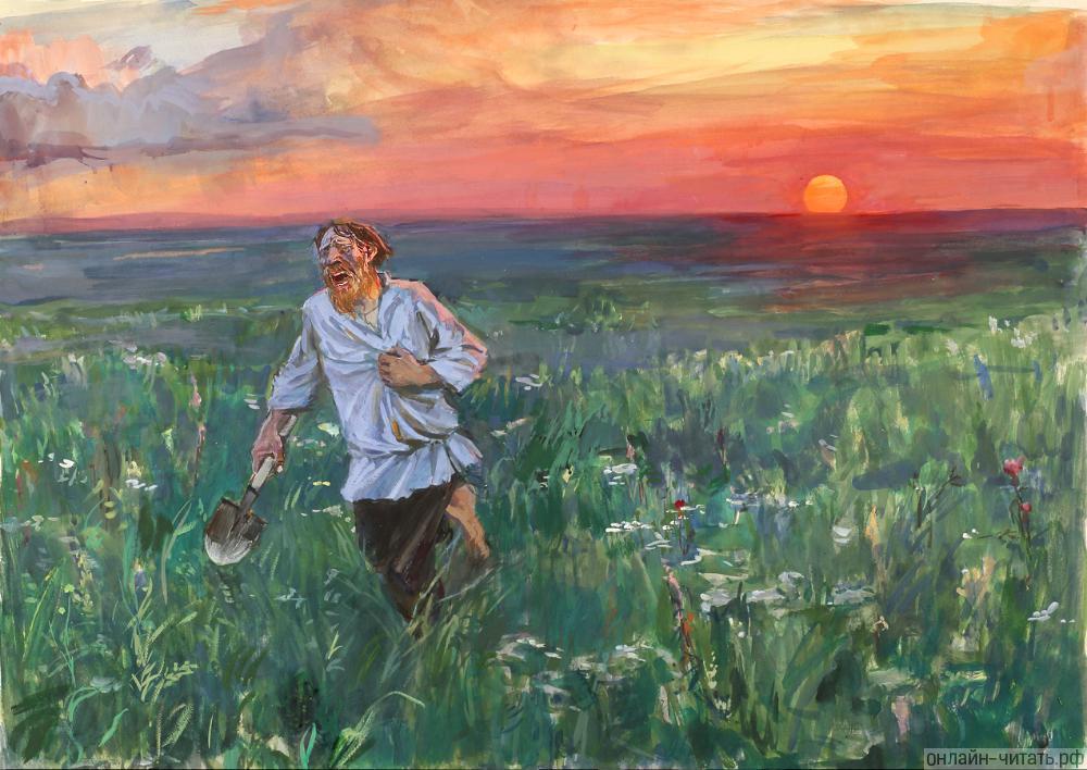 그날 밤, 파홈은 내일이면 드디어 많은 땅을 소유할 수 있다는 기쁨에 들떠서 잠이 잘 오지 않았습니다. 게다가 겨우 잠든 그는 꿈에서 악마의 발길 아래 죽어있는 자신을 보았죠. 다음날 아침 그는 자신의 체력을 자신하면서 열심히 걷기 시작했습니다. 오후가 되어 해가 내려가기 시작할 즈음부터는 마음이 급해서 뛰기 시작했습니다. 어느덧 해가 떨어지기 시작할 무렵 그는 마땅히 출발지로 되돌아가야 했으나 조금이라도 더 넓은 땅을 획득하려고 여전히 구간을 넓히는데만 몰두했지요.