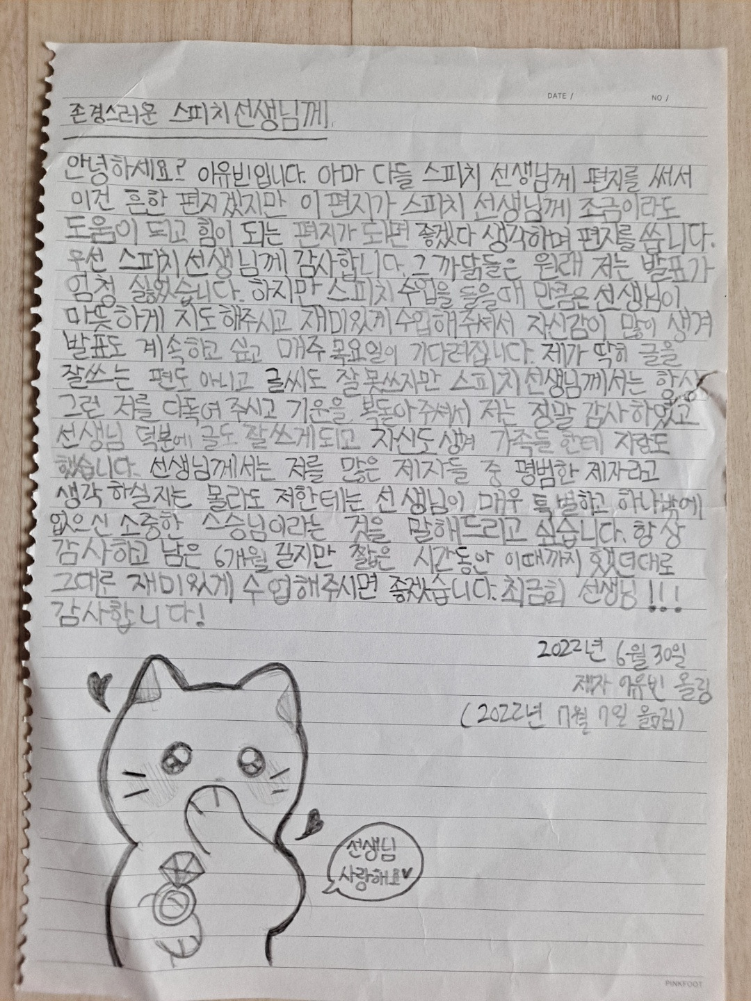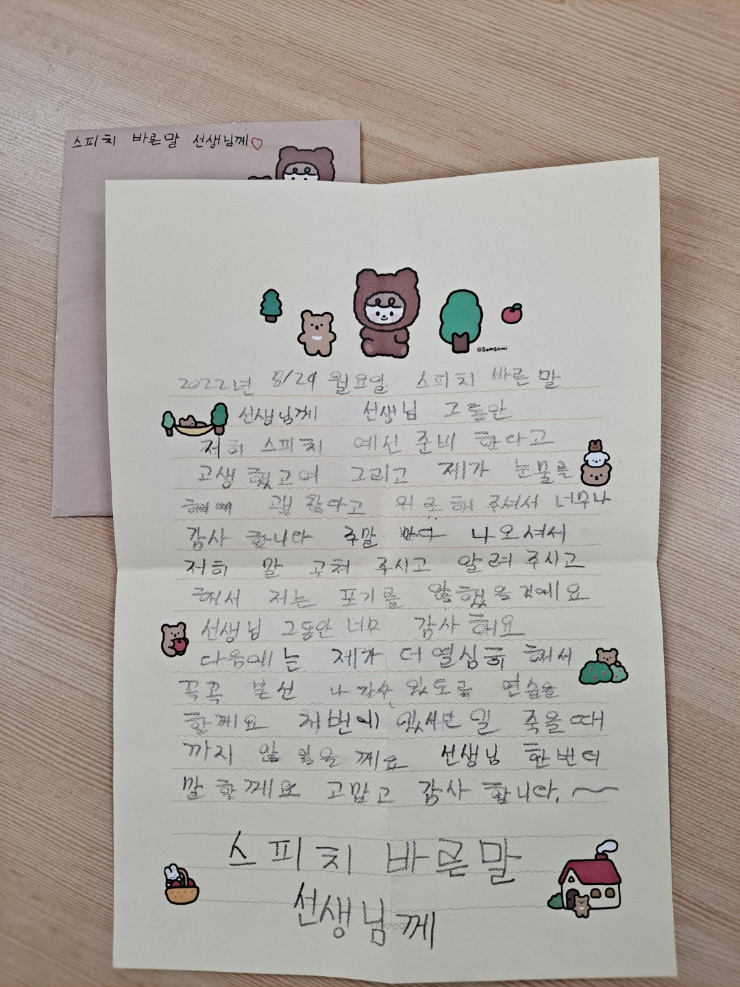 예선에 나갔던 아현이가 내게 쓴 편지 속 한 구절이다. 한 달 동안 학교 다니면서 틈틈이 각자가 원고를 쓰고 다듬고 연습한다고 어린 나이에 고생한 아이들이 스피치 대회를 준비하면서 갑자기 중학생이 된 것처럼 마음이 훌쩍 자란 것 같다. 매주마다 나는 계속해서 사랑의 편지를 받는다.