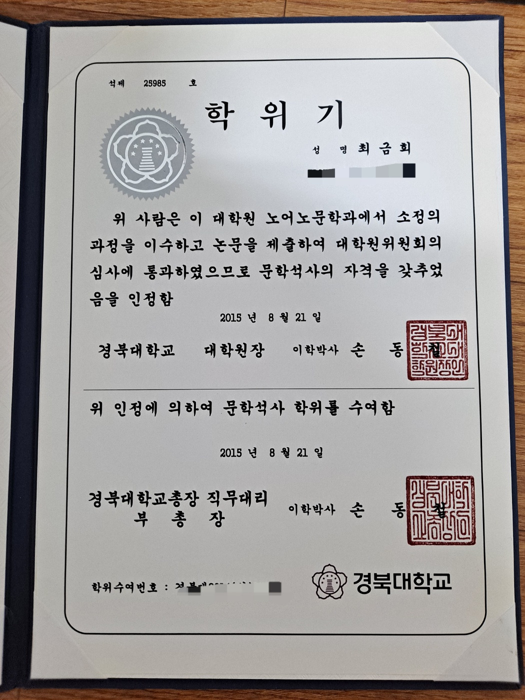 저의 졸업증서입니다. 졸업증서에 "논문을 제출하여 대학원 위원회의 심사를 통과했다"는 문구가 보이시죠?
