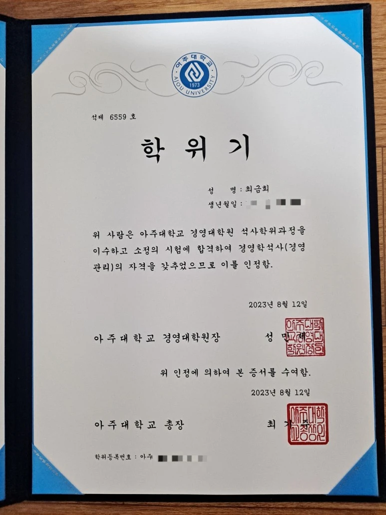 해서 아주대학교 경영대학원에 입학하여 작년 8월에 경영학 석사학위를 받았답니다. 즉, 위에서 설명해 드린 비논문학위과정을 밟은 거죠.