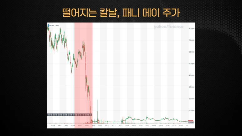 결과적으로 패니 메이가 보유한 서브프라임 모기지에서 손실이 쌓이기 시작했고, 2007년 10월에는 주가가 63달러에서 1달러 미만으로 폭락했습니다. 현재 패니 메이의 주식은 여전히 동전주 수준을 벗어나지 못하고 있습니다.